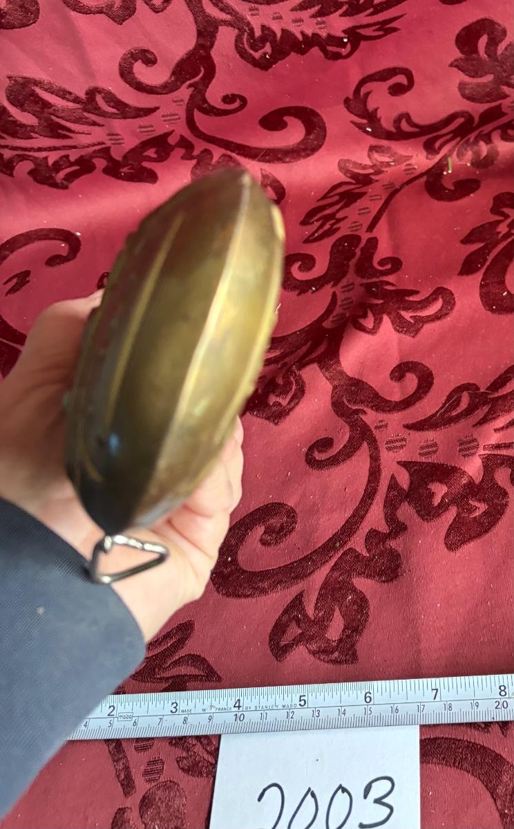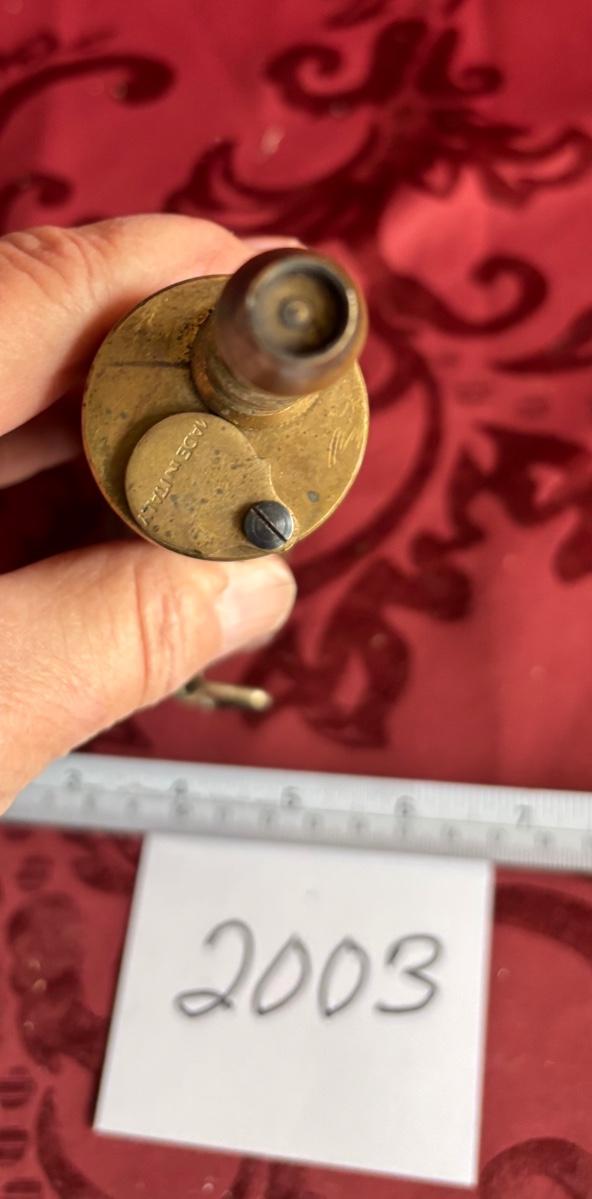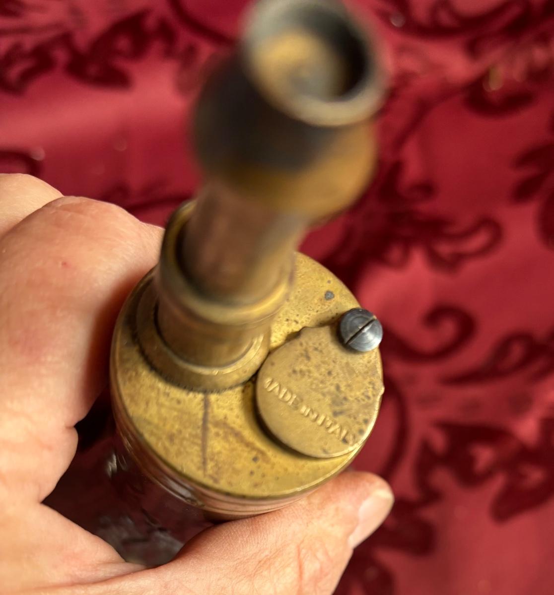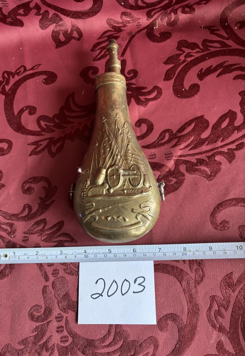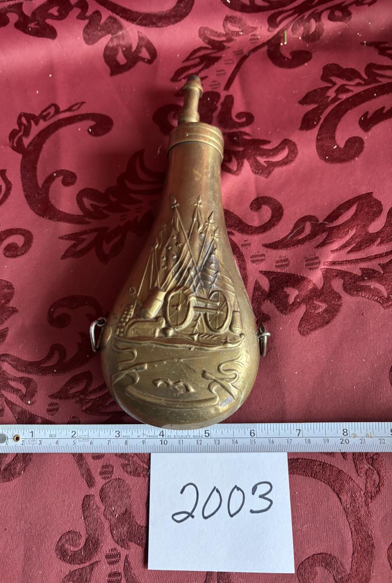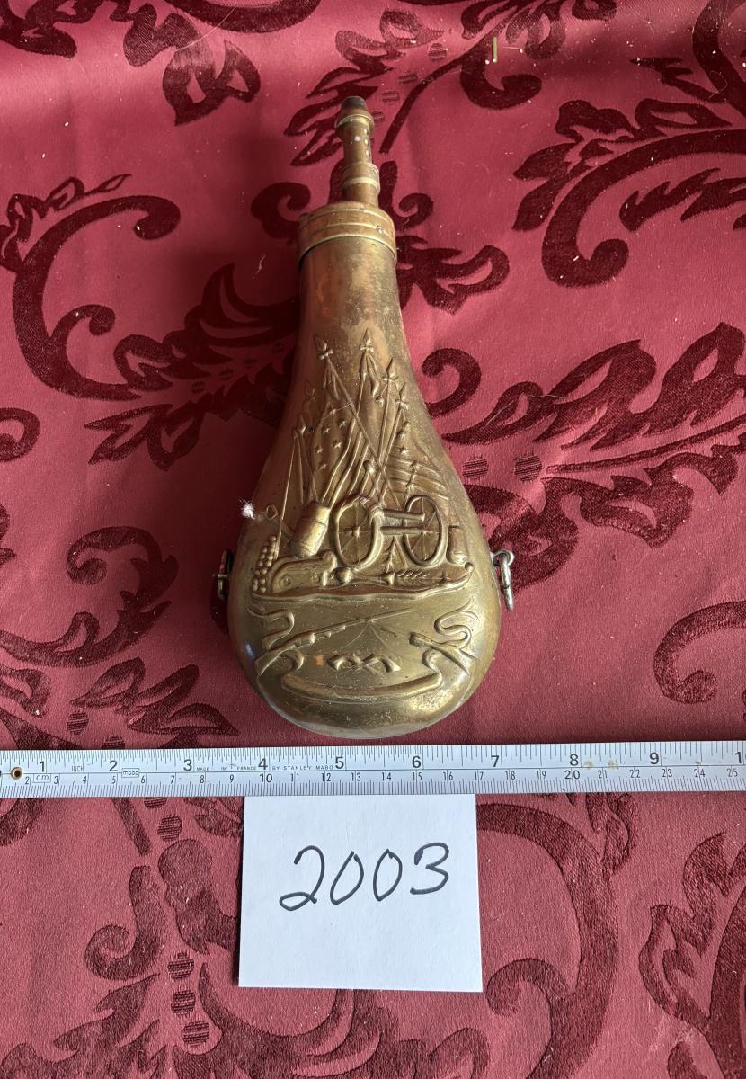 Vtg Brass Reproduction, Black Powder Flask/Horn Embossed W/Cannon & Flags Empty!