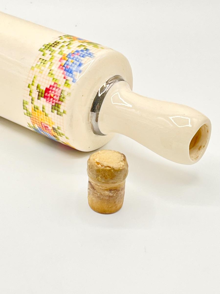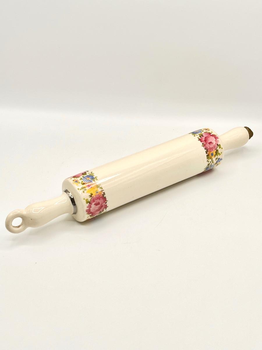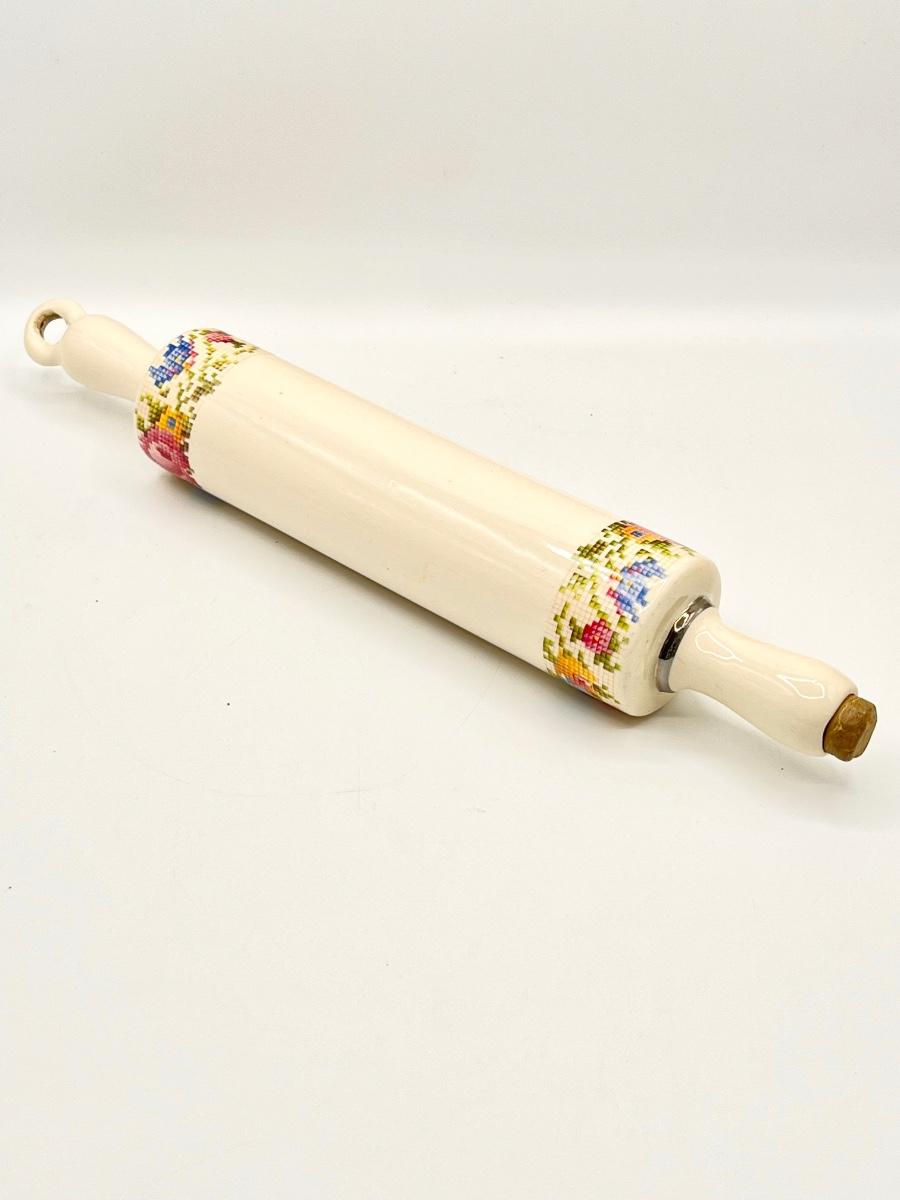 Vtg. Ceramic Rolling Pin With Cross Stitch Floral Pattern