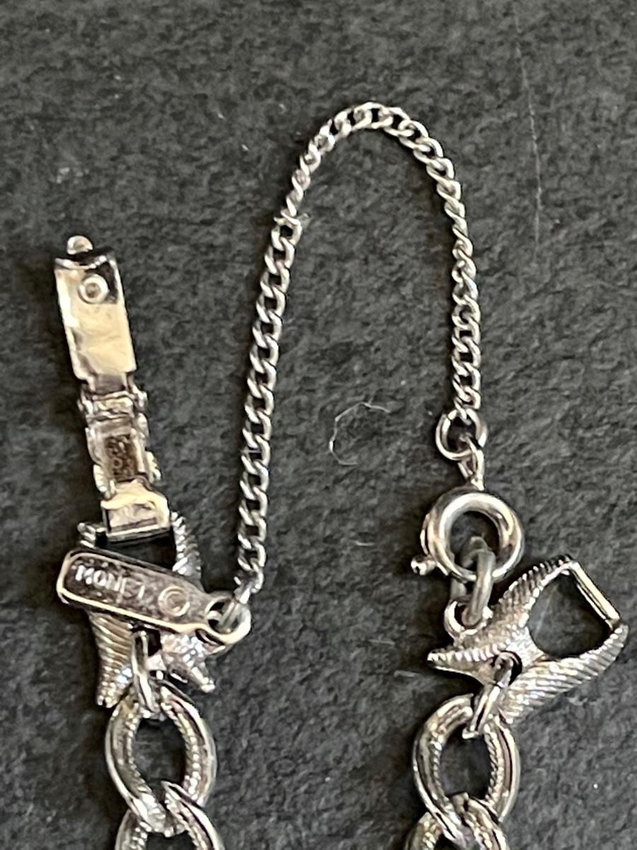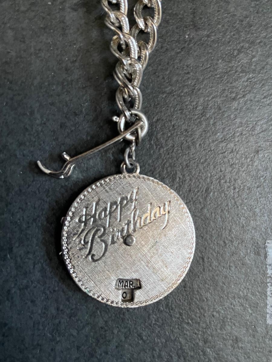 This bracelet has fold-over clasp and a signed Monet on the back of the clasp. This charming bracelet measures 7 1/4” in length and includes the Happy Birthday charm. 1” in diameter.