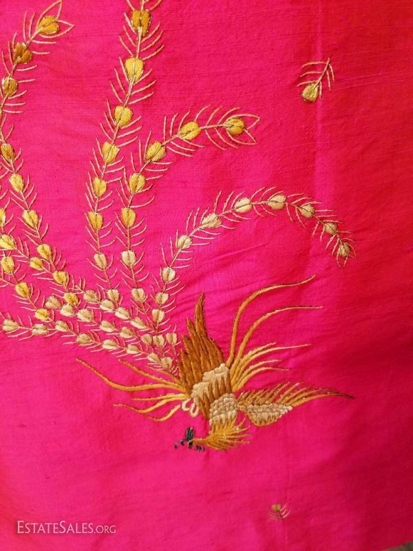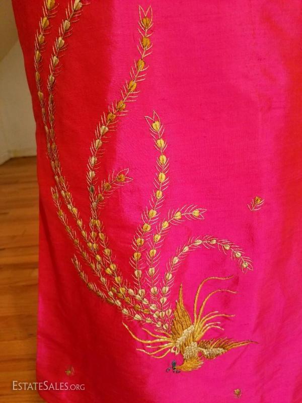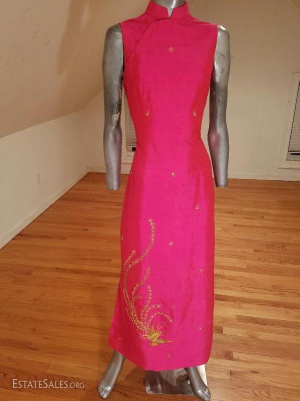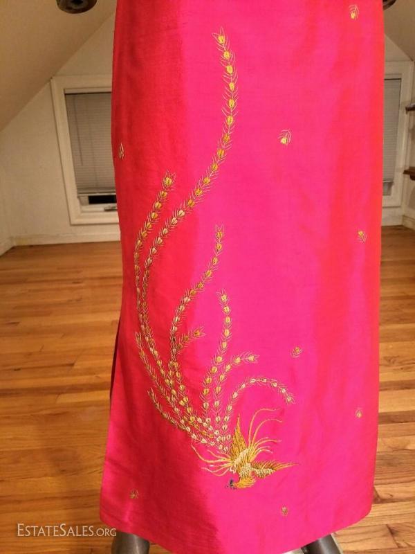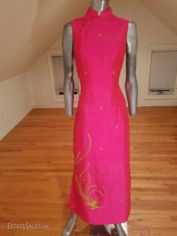 An amazing work of silk and gold embroidery in Oriental Art. All silk lined Cheongsam Chipao with gold embroidery of Phoenix and blossoms throughout the gown. In a gorgeous cerise coloration.Hook & eye