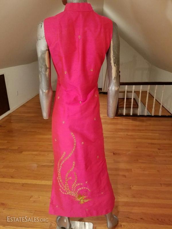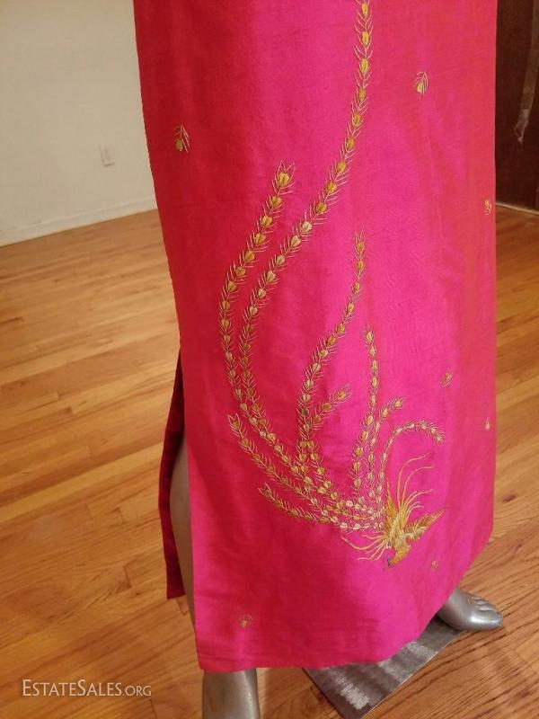 An amazing work of silk and gold embroidery in Oriental Art. All silk lined Cheongsam Chipao with gold embroidery of Phoenix and blossoms throughout the gown. In a gorgeous cerise coloration.Hook & eye
