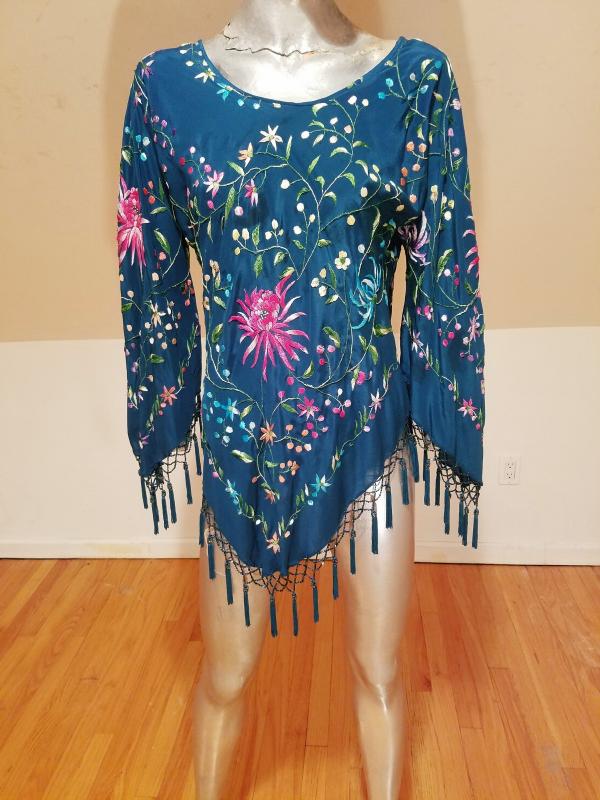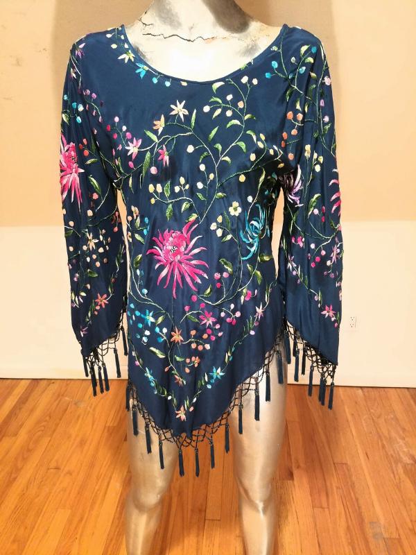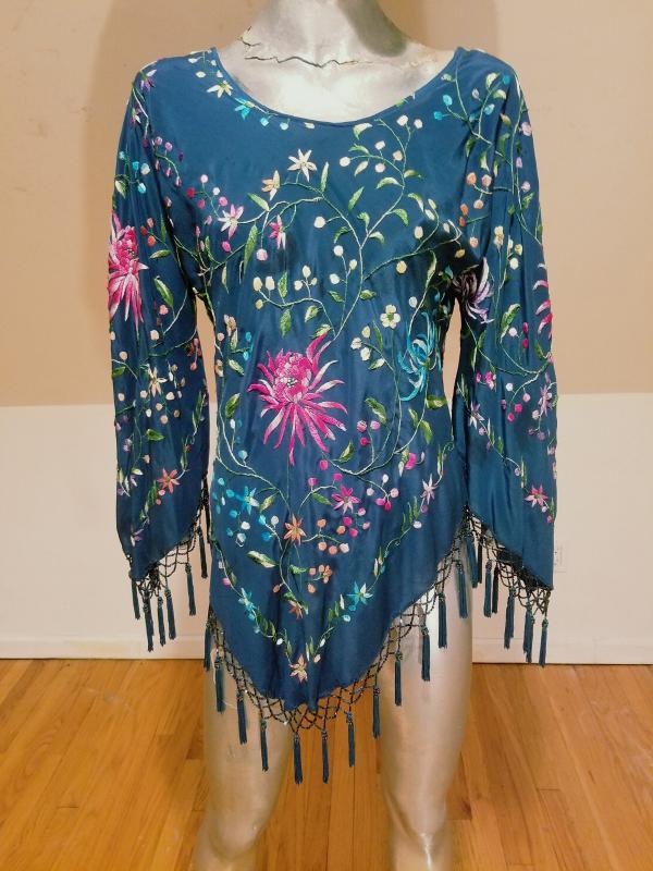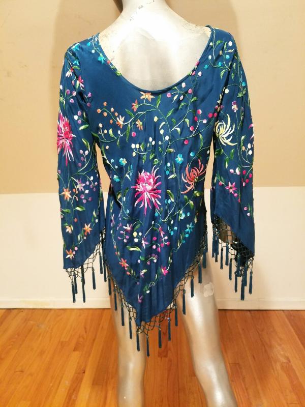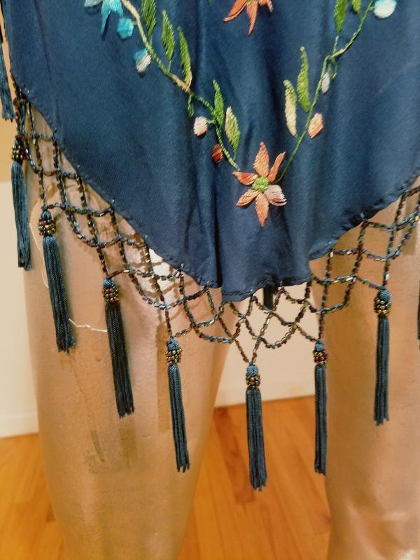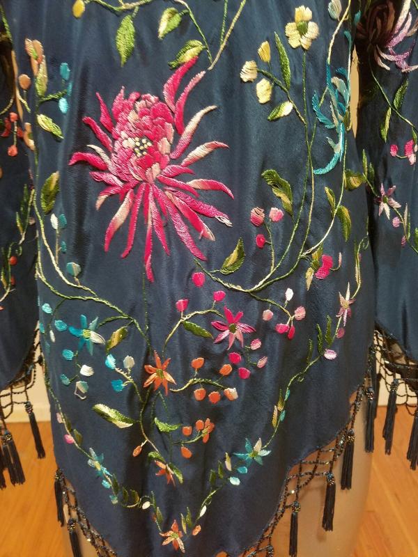 True beauty of a vintage top all embroidered fro a Canton Piano shawl Chrysanthemums with beaded fringes . So rare and beautiful this one is a site to see. A dark green coloration background .