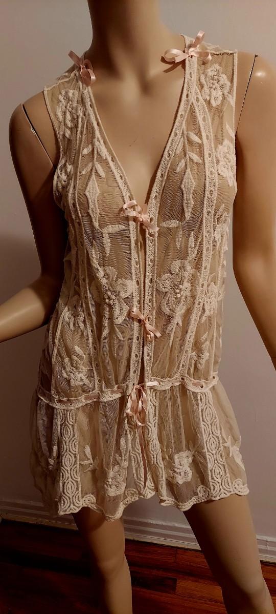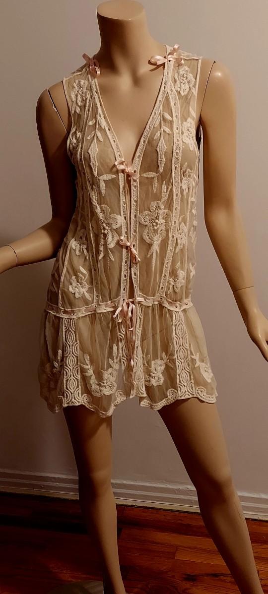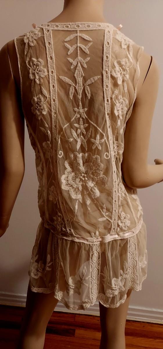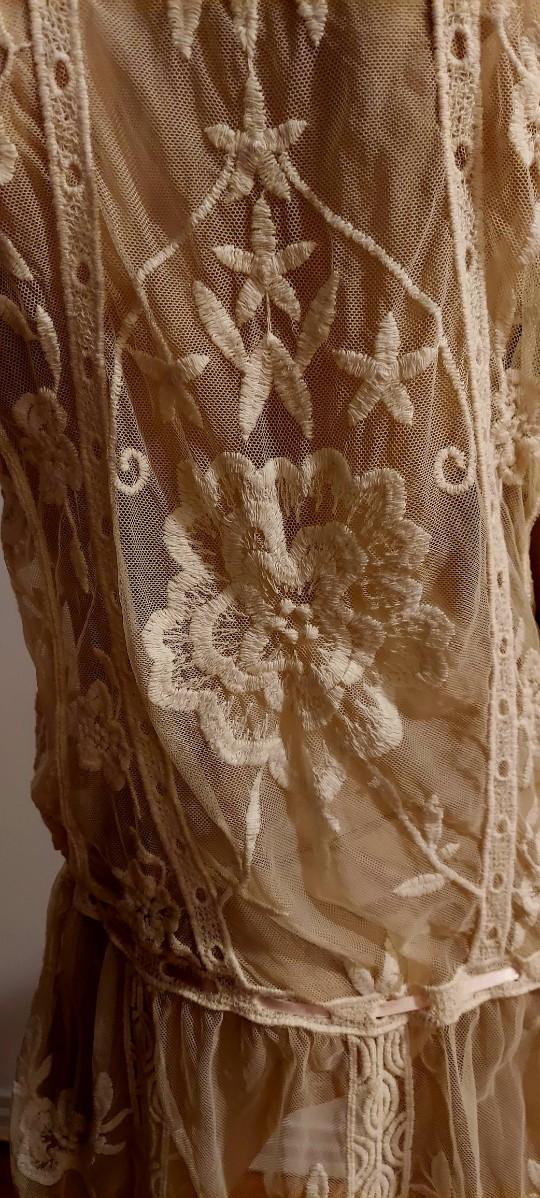 Gorgeous Layering Lace on Tulle Embroidery long Tunic with Baby Pink silk Ribbons.