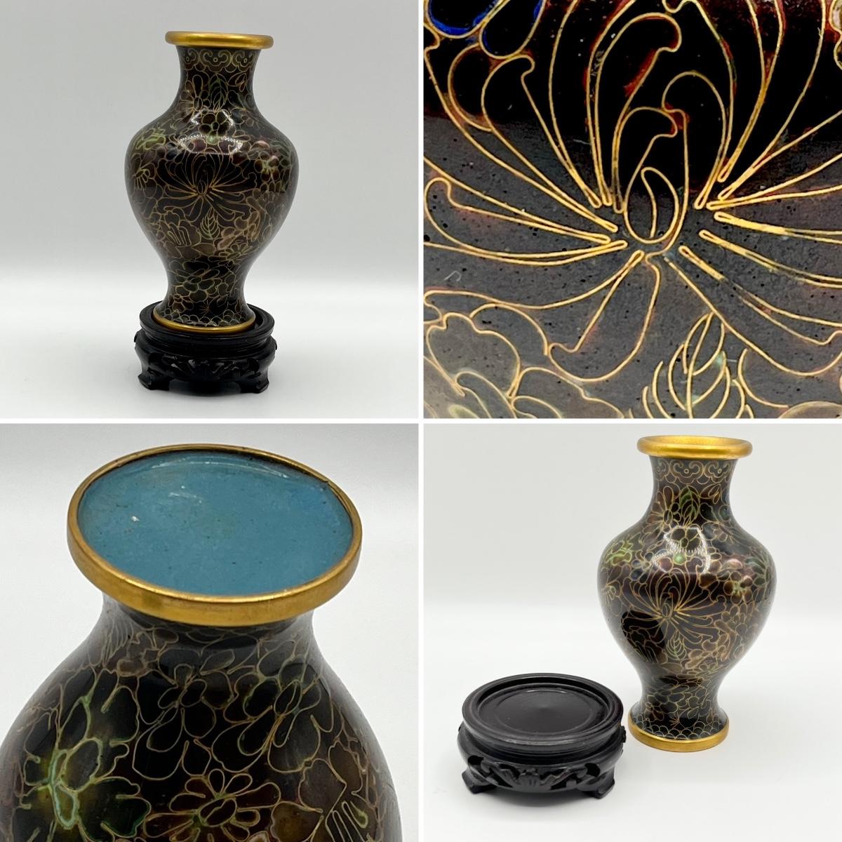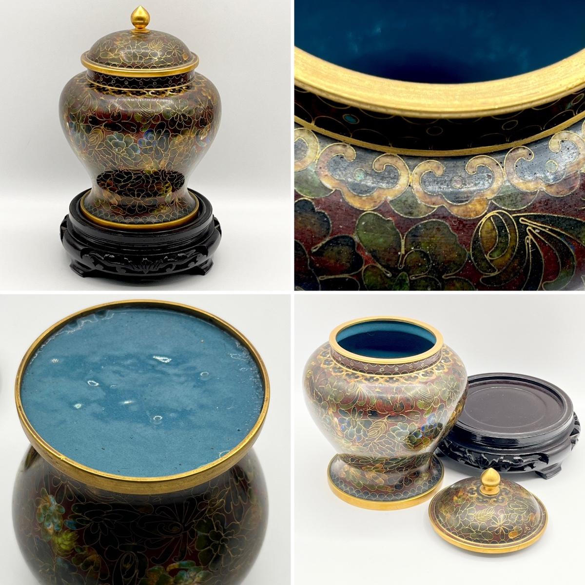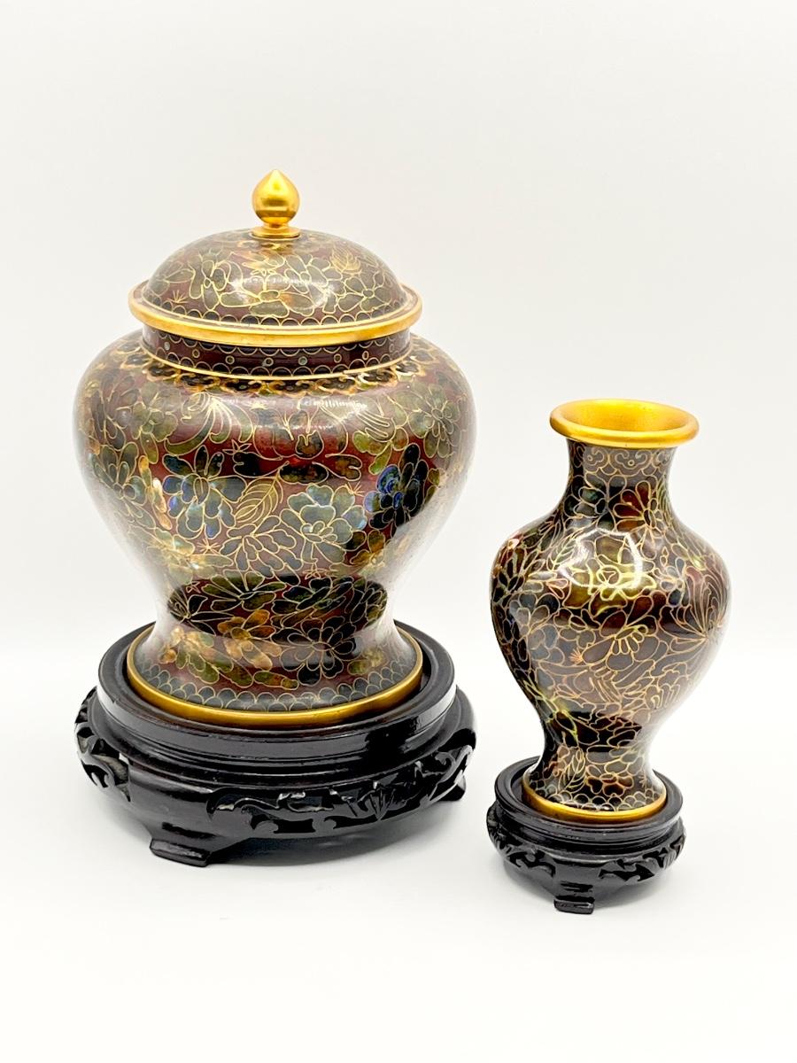 Vtg. Cloisonne Ginger Jar & Vase On Wooden Base