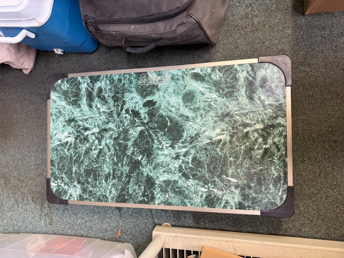 Vintage Coleman Folding Table is 63” long x 24” wide and 28.5” tall when opened up; 30” x 31” x 2.5” closed for carrying. In great condition structurally. A bit of oxidation on two clasps that secure table. Pick up next to Fred Meyer on Walker and 158th. No problem with contactless exchange.