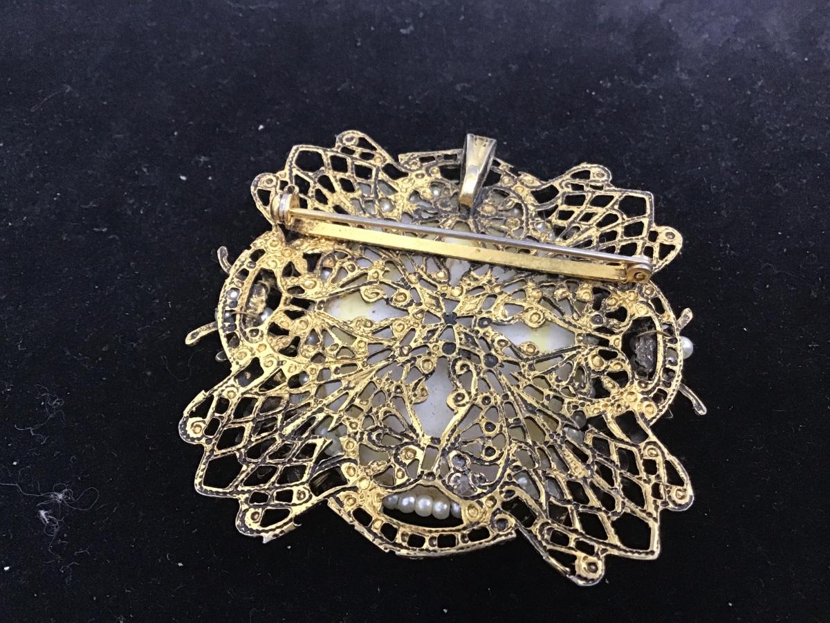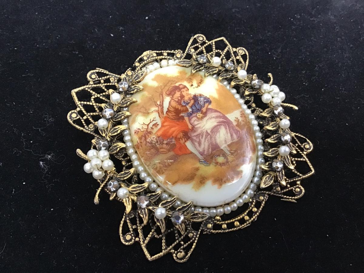 Vtg Colonial Courting Couple Porcelain Brooch/Pendant Filigree