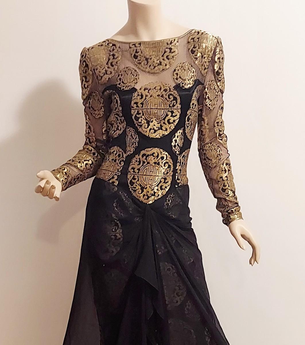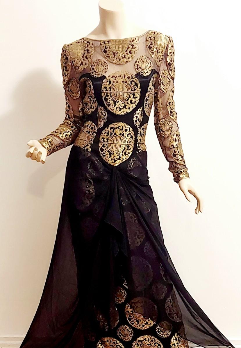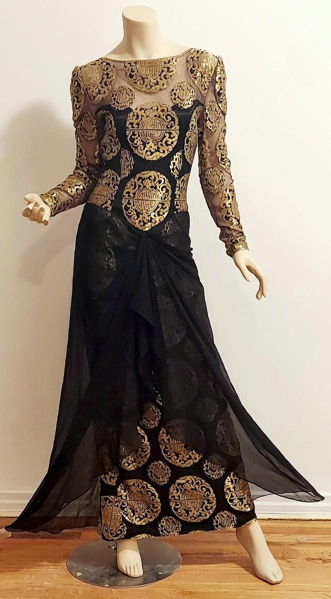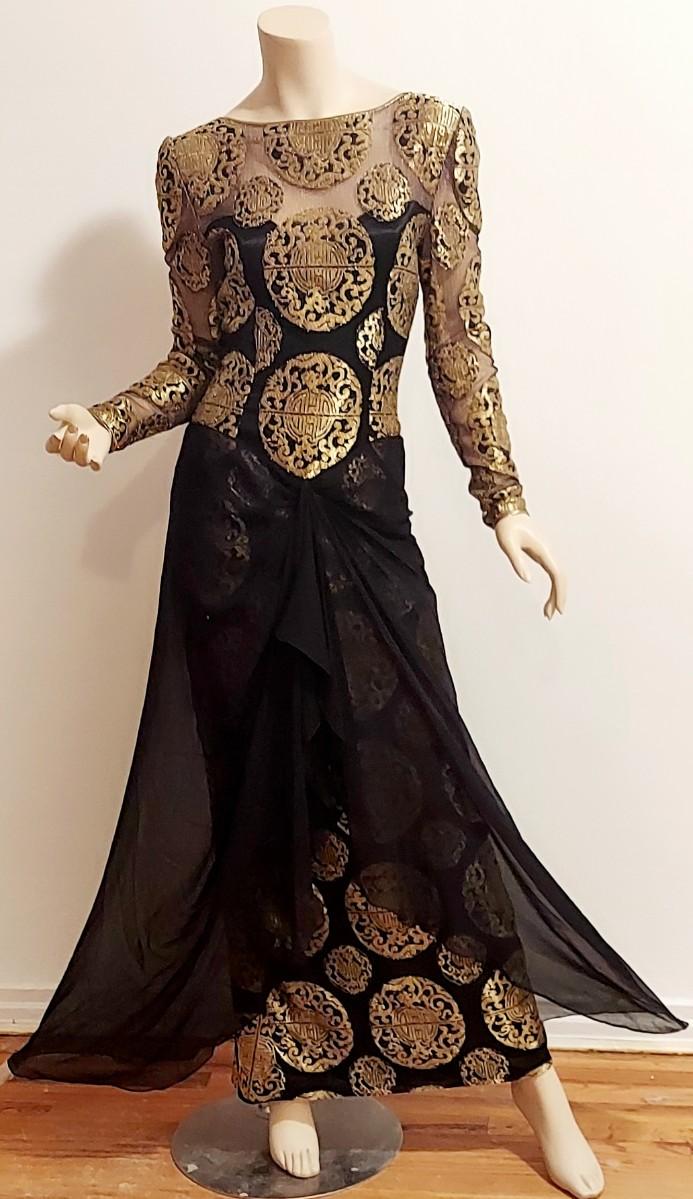 Vtg Couture Michael Casey 80s Chiffon/Gold Metallic maxi dress