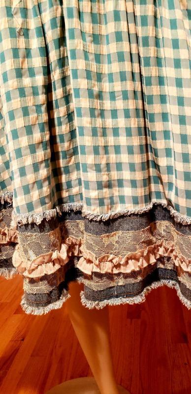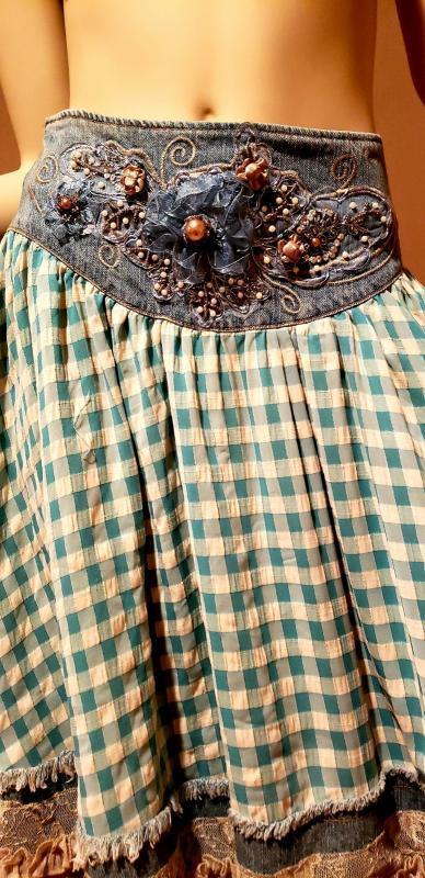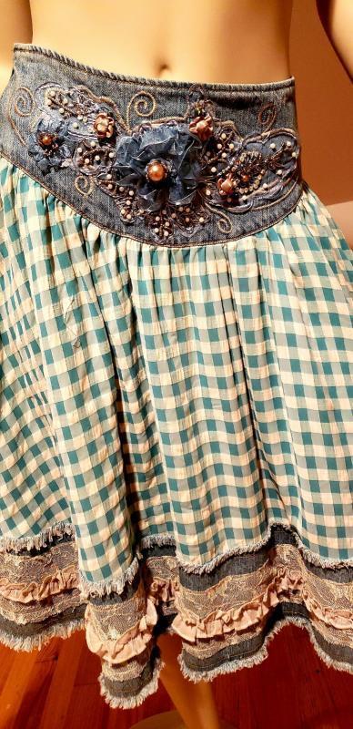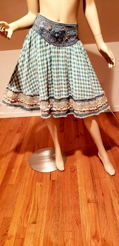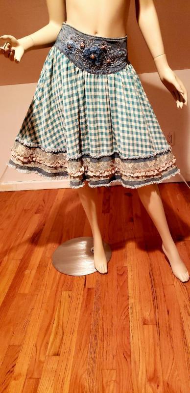 Amazing 1970's Era Denim full sweep skirt with all hand work of embroidered lace and 3D flowers.