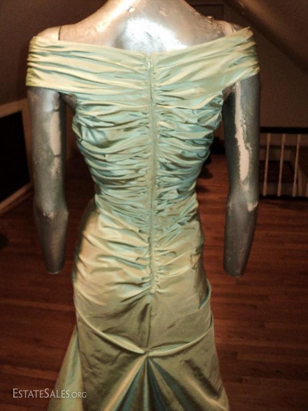 A showstopper of a designer gown . All in shantung satin with shirred details and train.