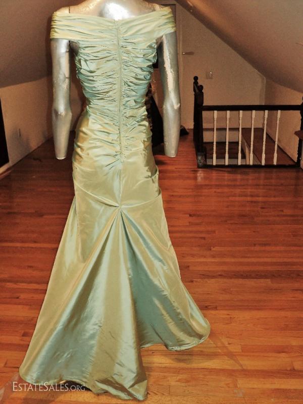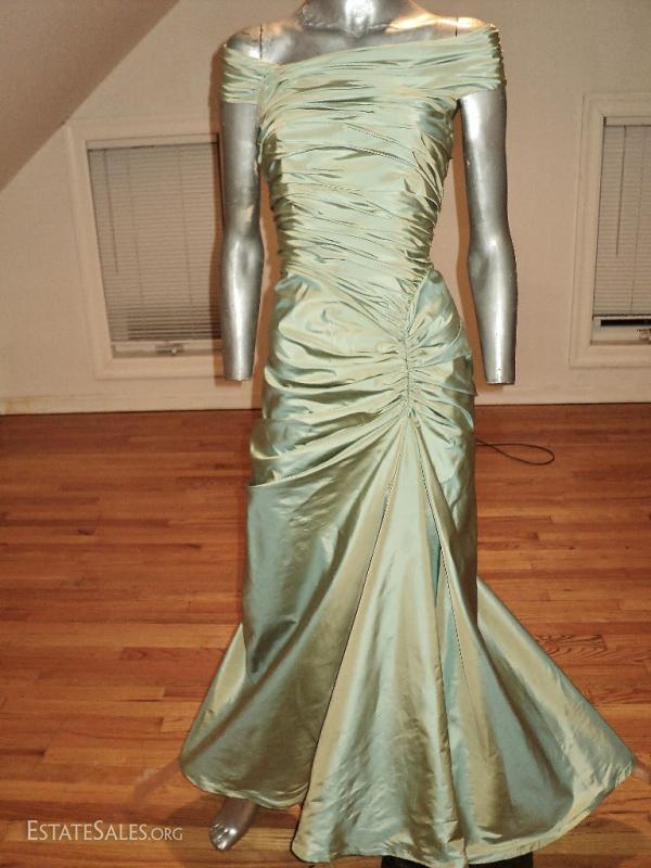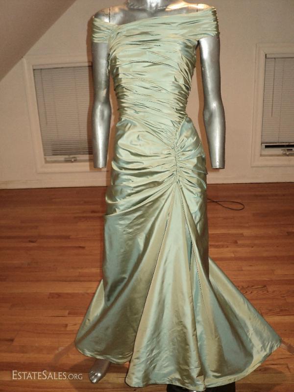 A showstopper of a designer gown . All in shantung satin with shirred details and train.