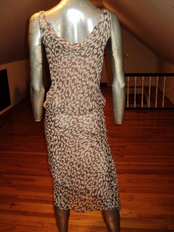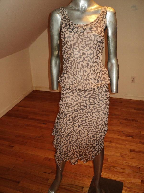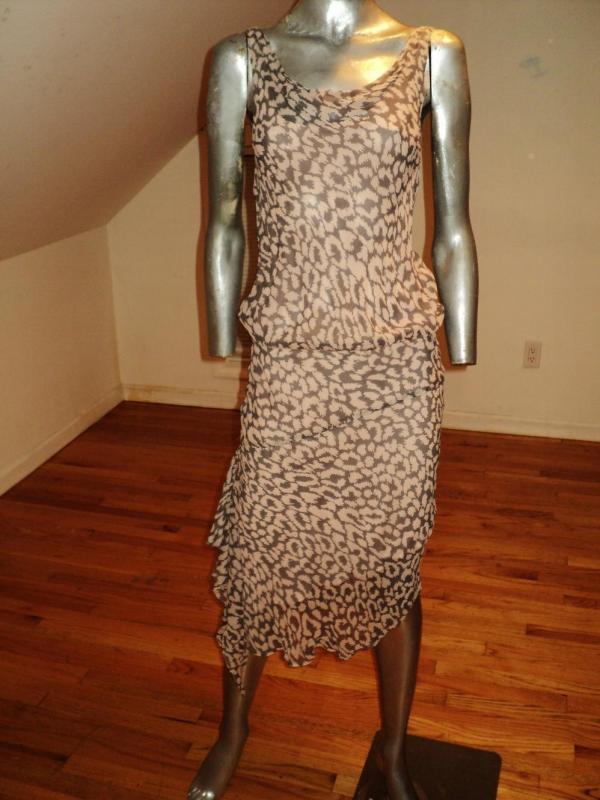 Diane von Furstenberg asymmetric ruffled high low dress. 100% silk in an animal print chiffon. Very light pale pink and light grey taupe. Elastic waist and a silk crepe underlayer. In like new condition. Hardly worn