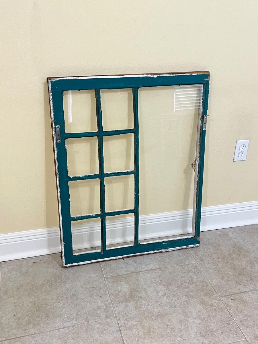 Has all glass panes ~ Back side is a dark teal color ~ 34" H x 27.5" W x 2" D
