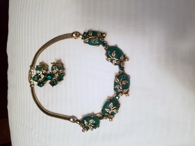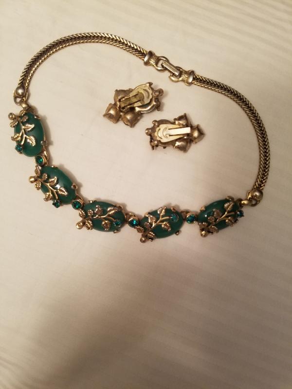 Vtg Emerald green Gold Vine rhinestone Necklace/Earring costume set