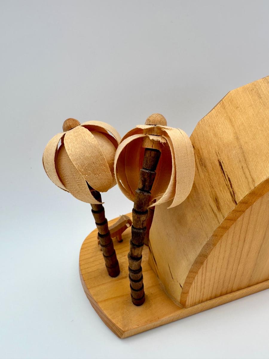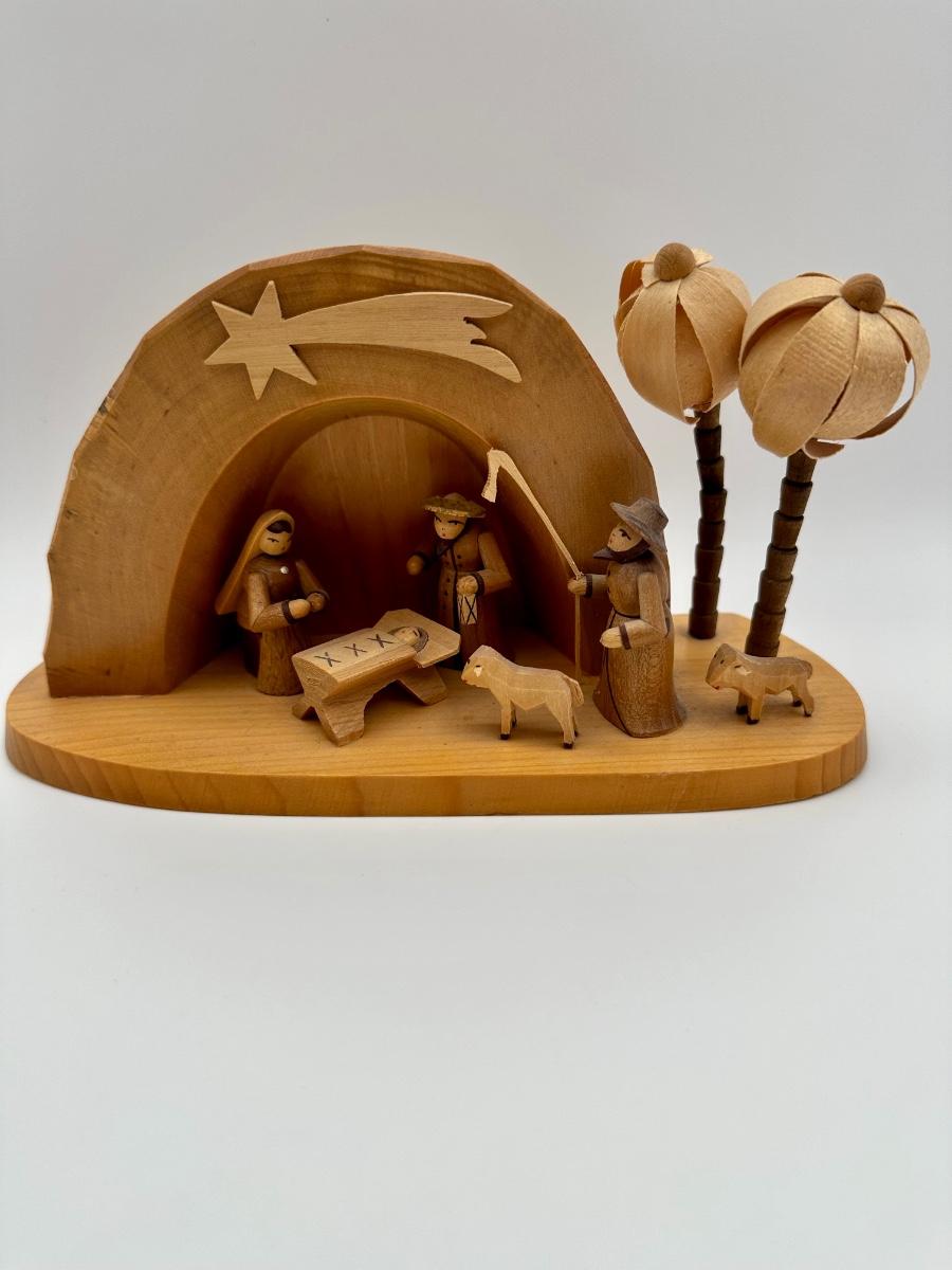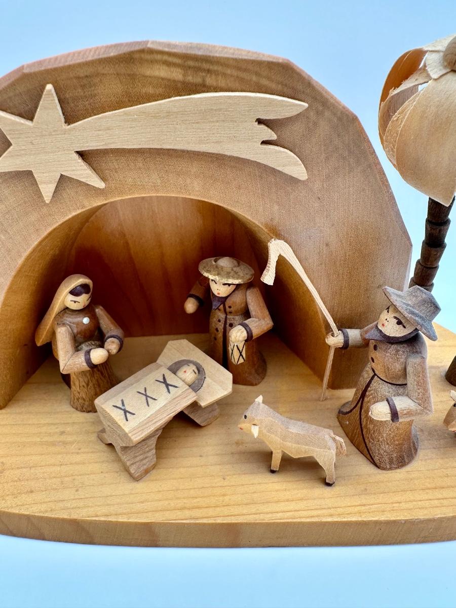 Hand carved, from Germany. Fronds missing from back of one tree, shepherd’s staff is broken (not straight), still a great piece, see pictures.