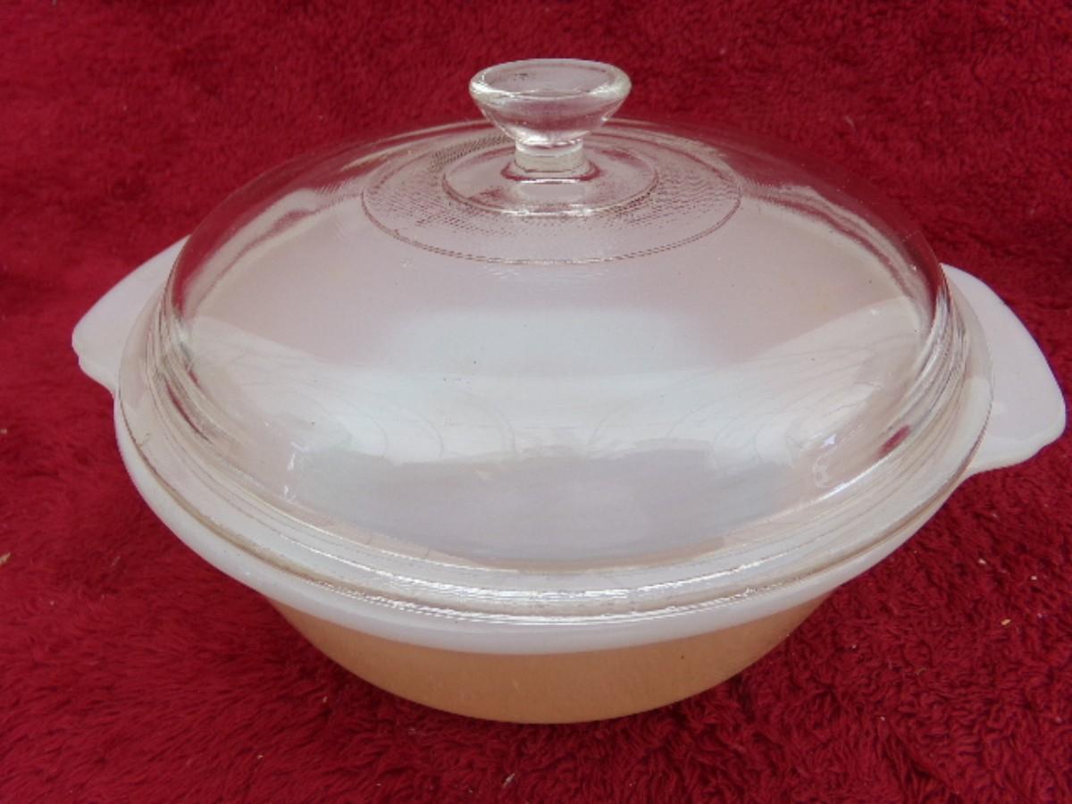 VTG FIRE KING ovenware casserole w/lid. Opalescent Peach/white