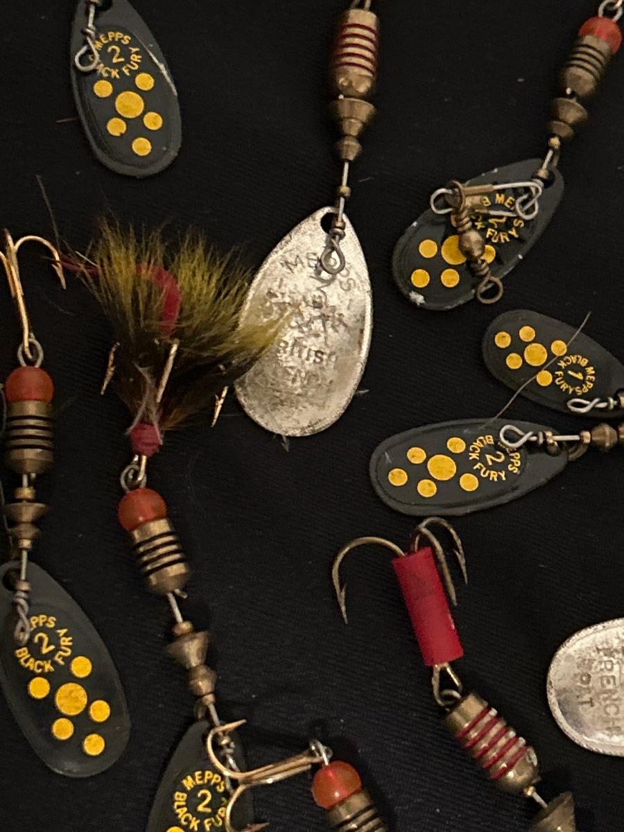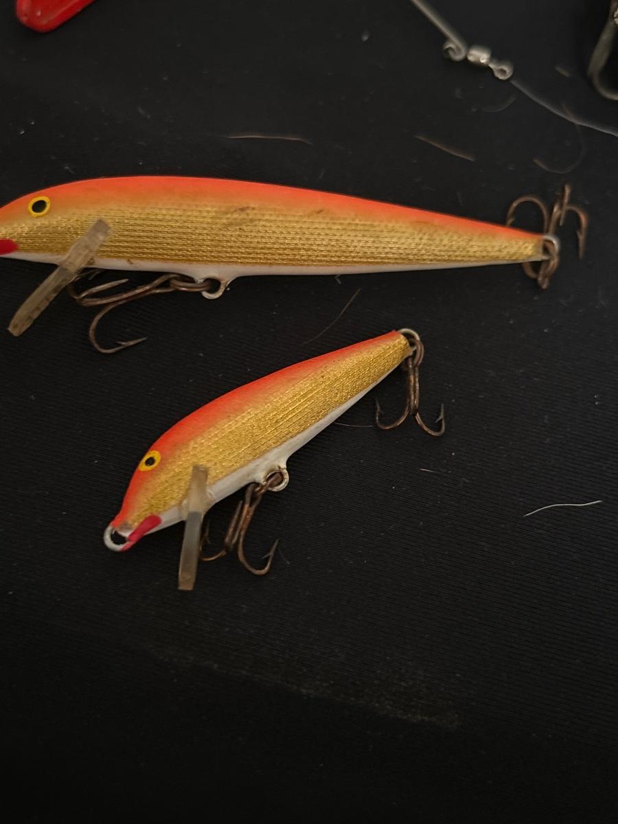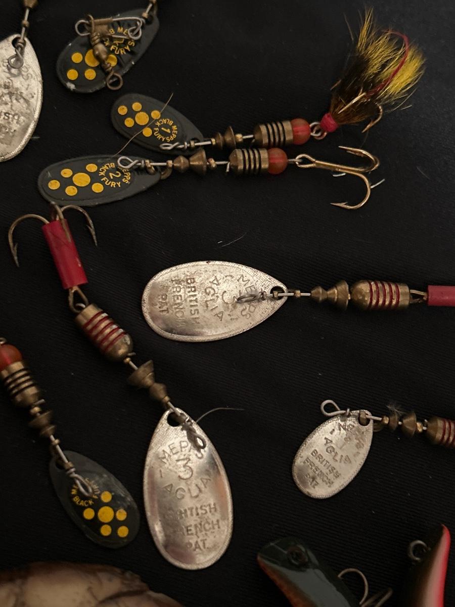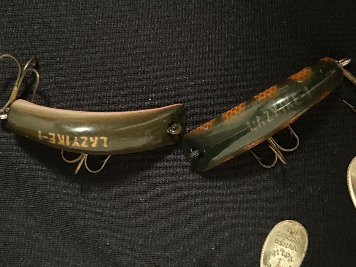 I found the dardevle in a tackle box. It doesn’t look like it’s been used. I think the adhesive on the box came loose. The smaller one is in rough shape though. The two matching orange are both Rapala (different sizes). There are two lazy ikes and the bug looking one is a Rebel. The Mepps range from 1-3