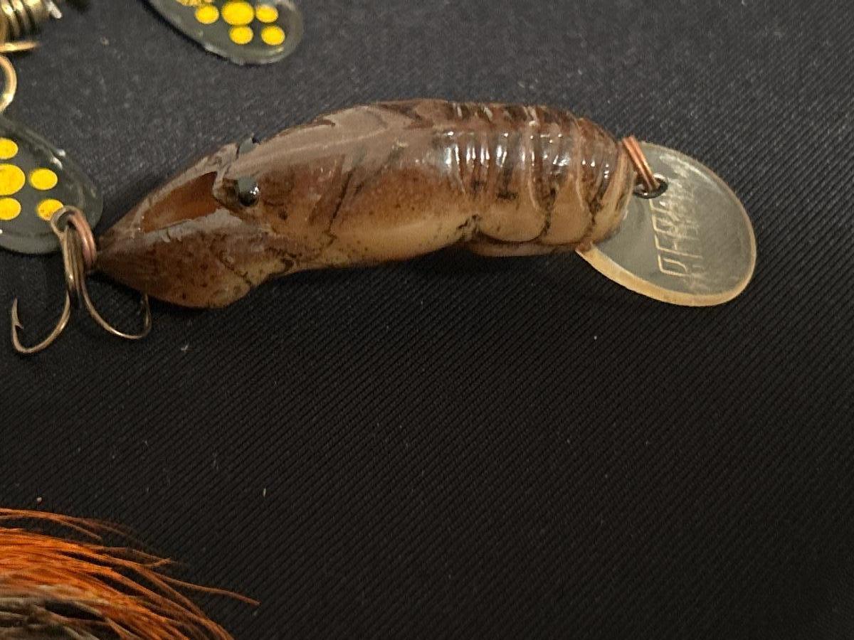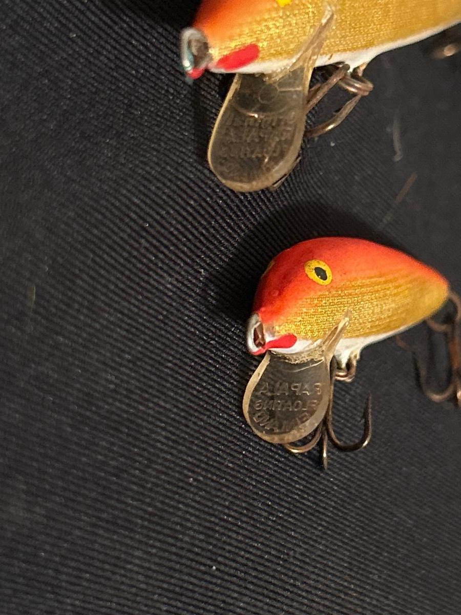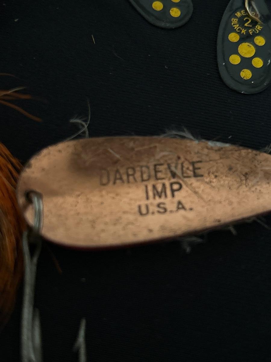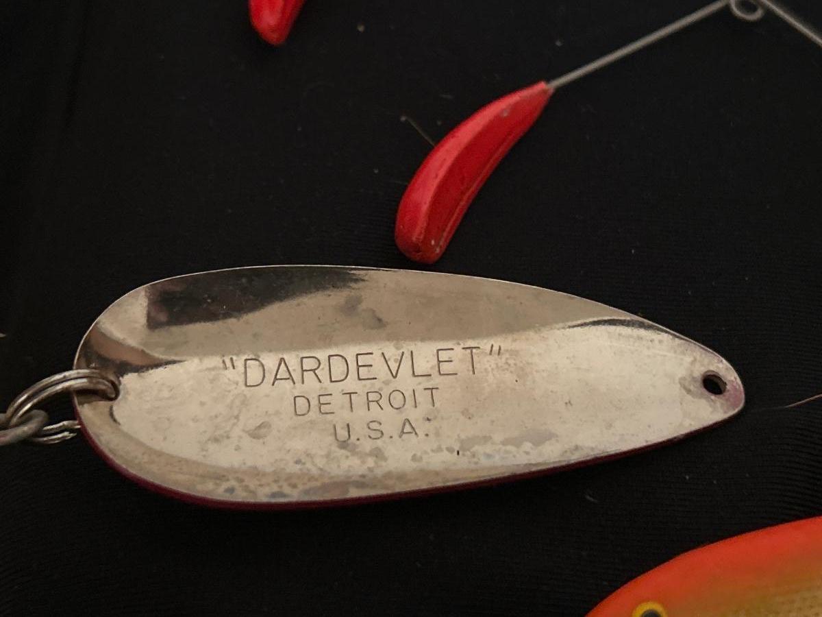 I found the dardevle in a tackle box. It doesn’t look like it’s been used. I think the adhesive on the box came loose. The smaller one is in rough shape though. The two matching orange are both Rapala (different sizes). There are two lazy ikes and the bug looking one is a Rebel. The Mepps range from 1-3