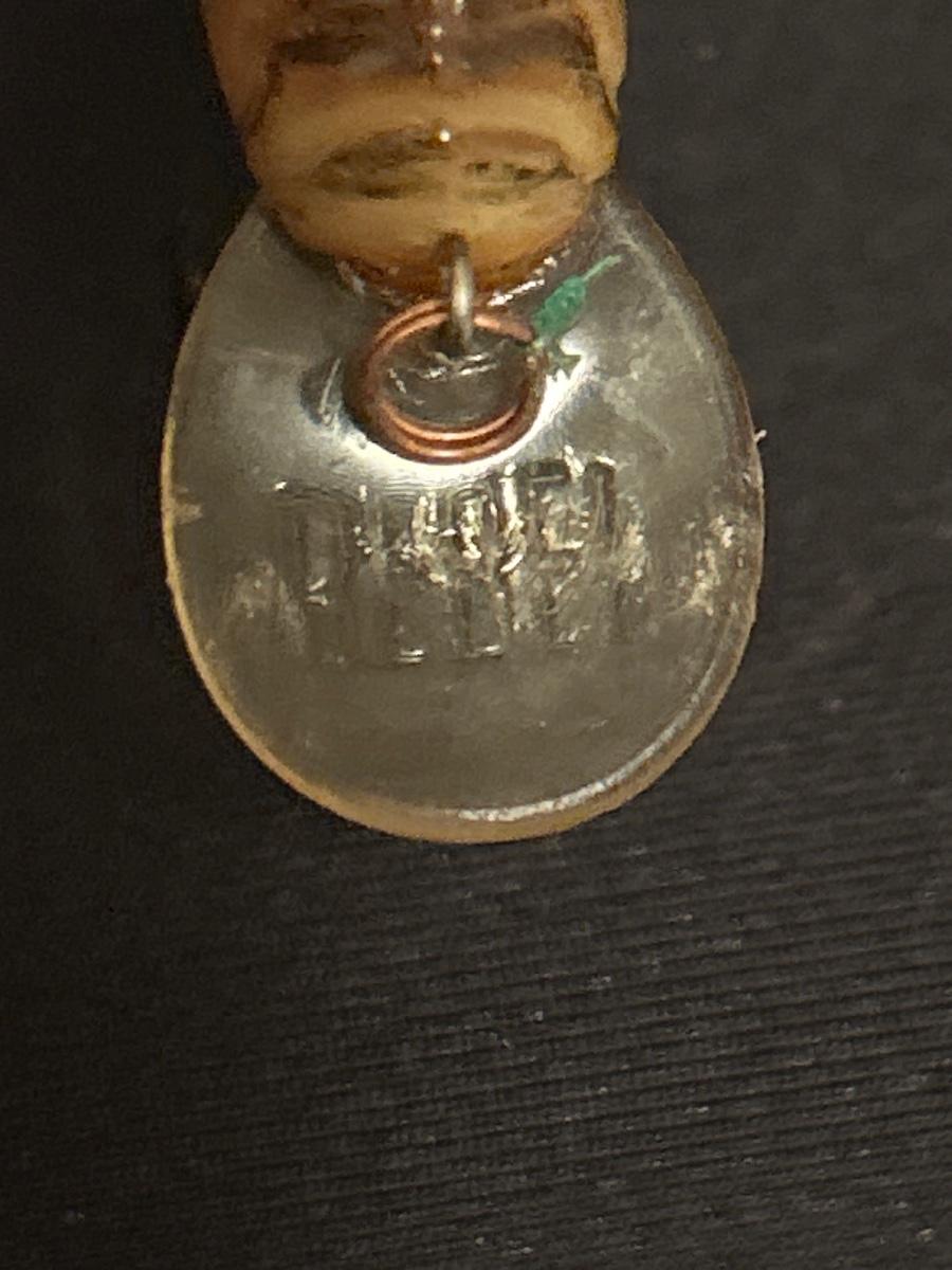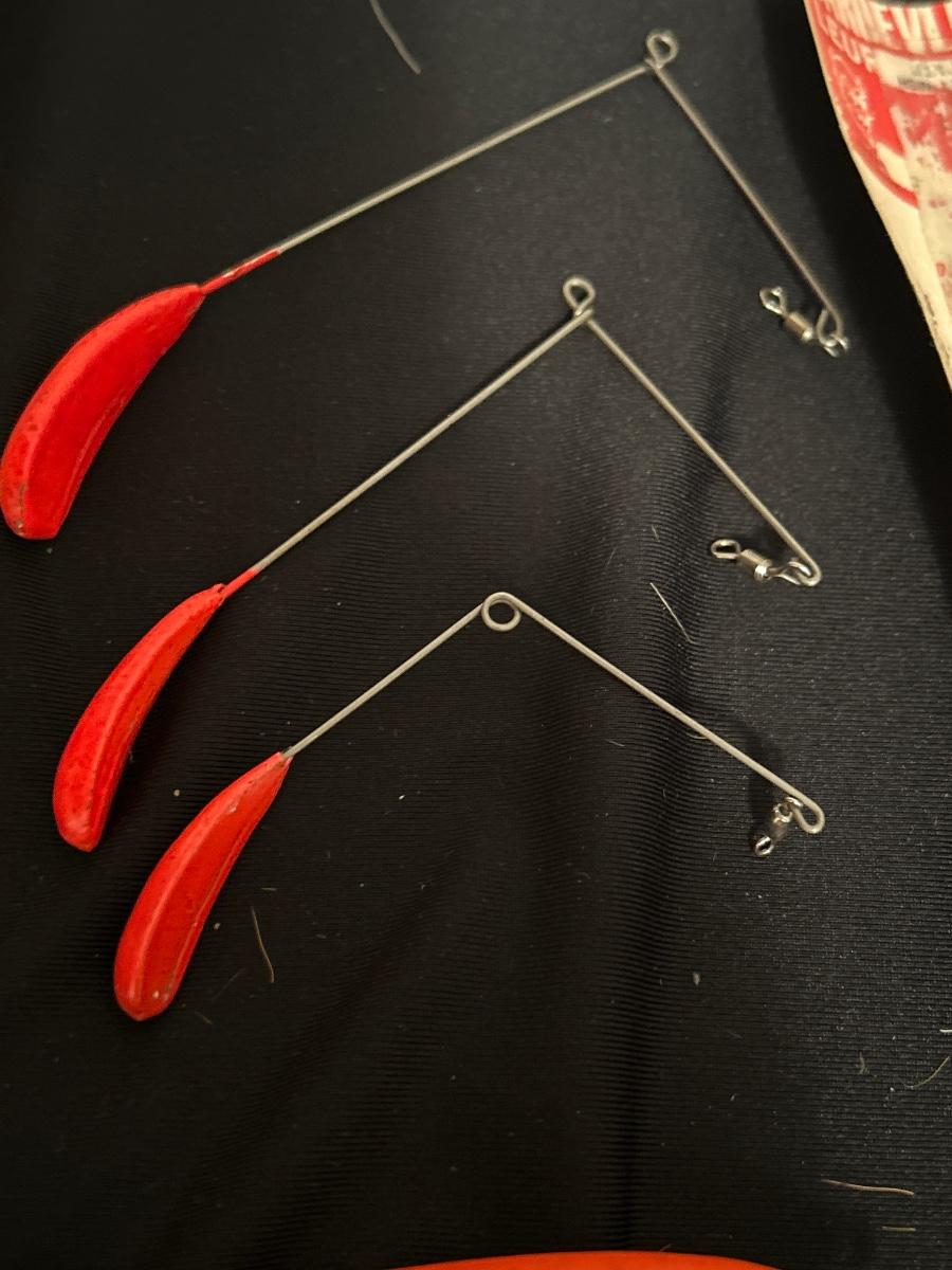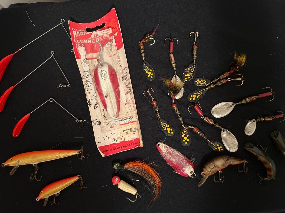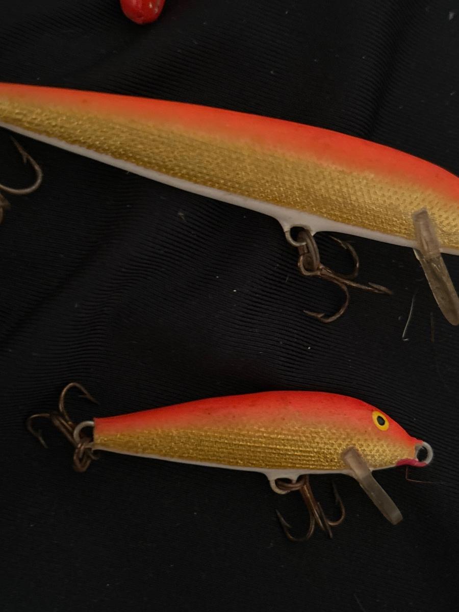 I found the dardevle in a tackle box. It doesn’t look like it’s been used. I think the adhesive on the box came loose. The smaller one is in rough shape though. The two matching orange are both Rapala (different sizes). There are two lazy ikes and the bug looking one is a Rebel. The Mepps range from 1-3