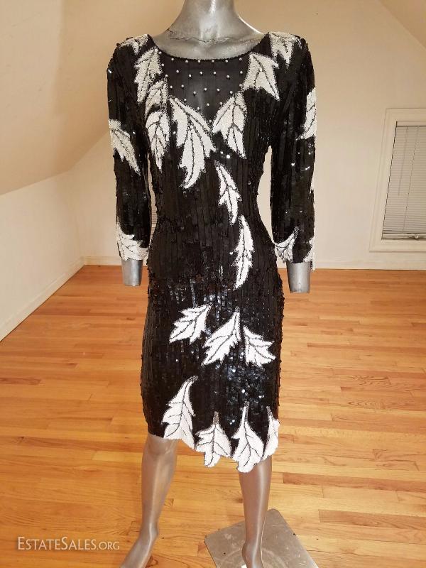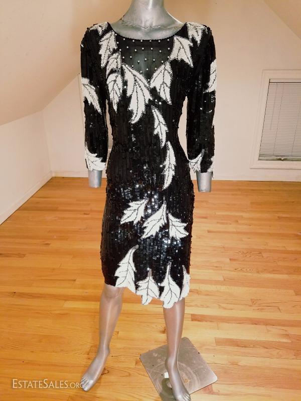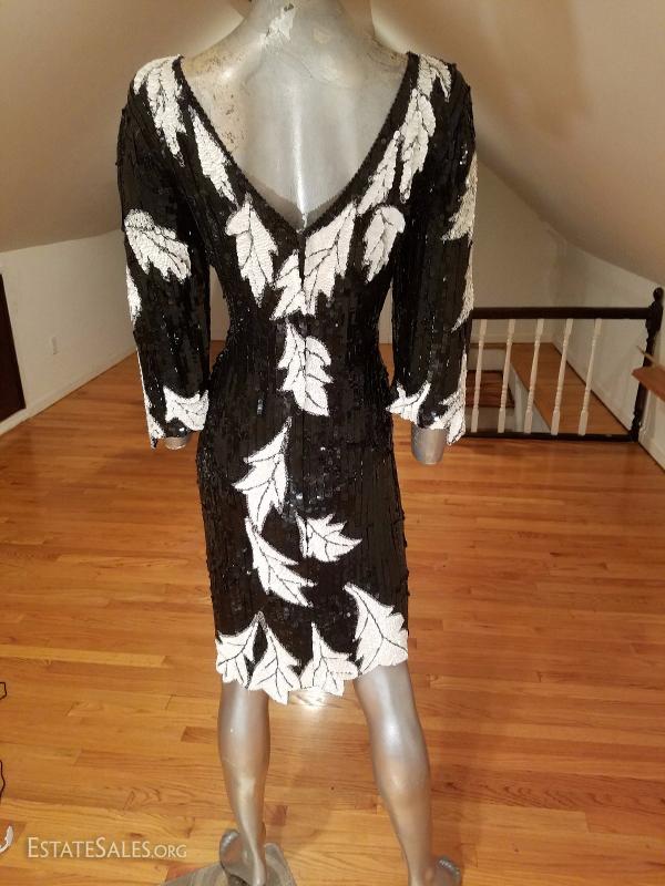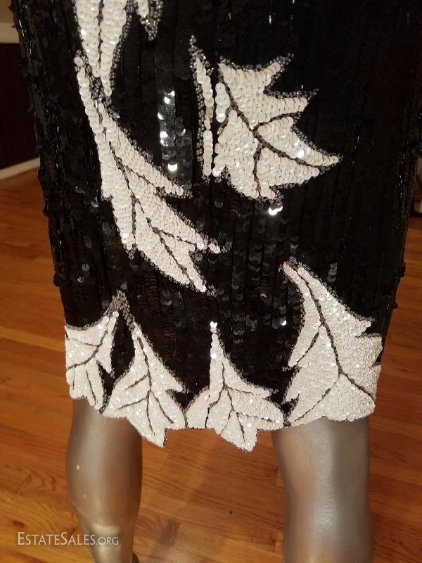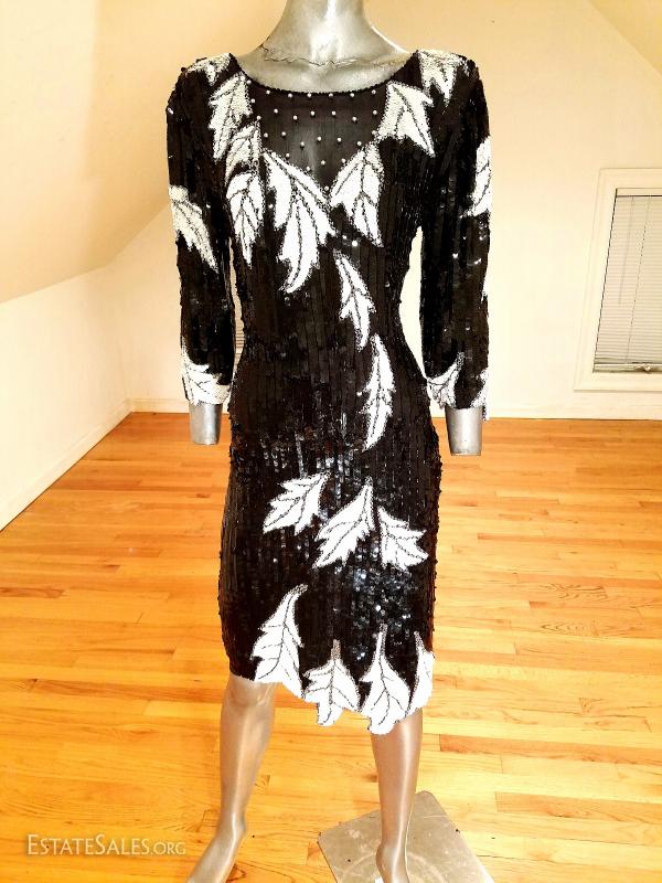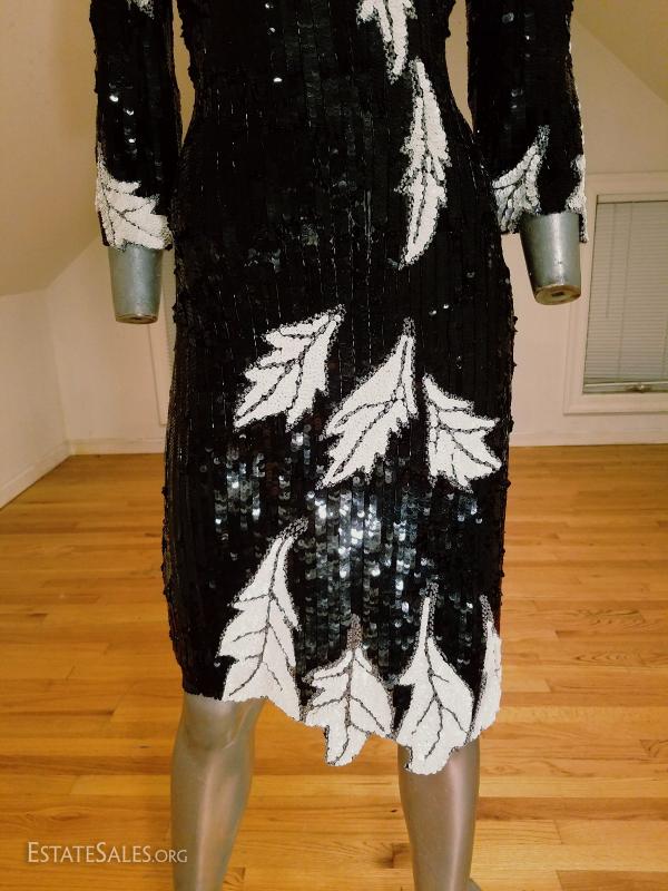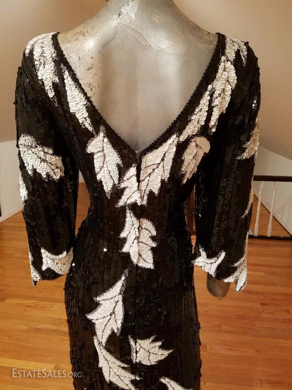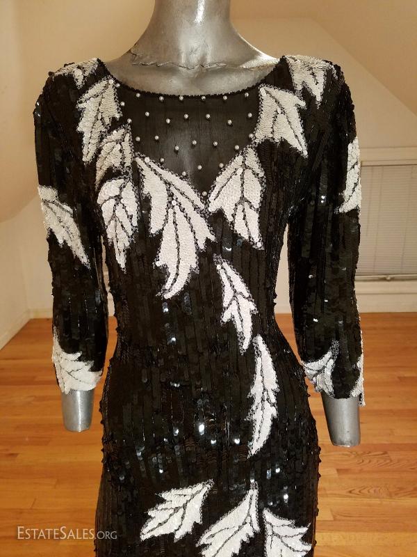 Amazing beauty from the 1970's fully beaded and sequined in a leaf black & white design and illusion bodice.. All silk and amazing