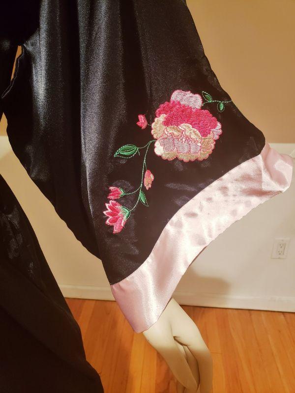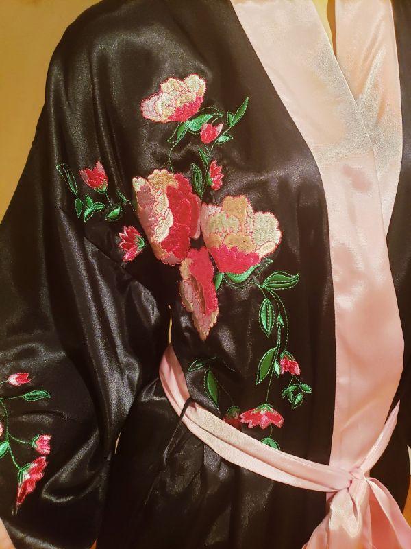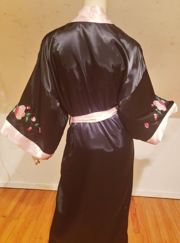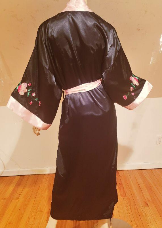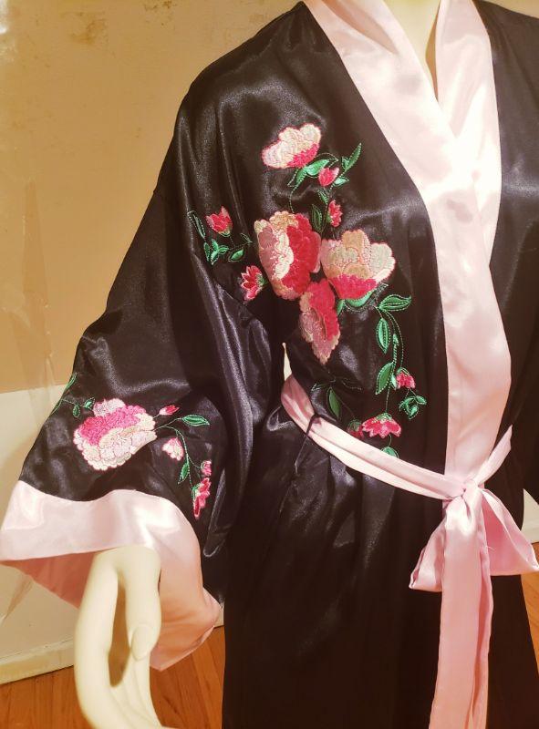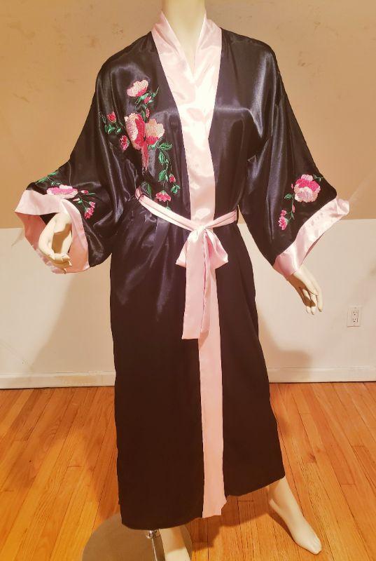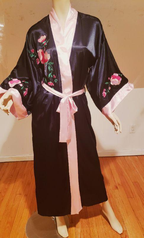 Circa 1980's famous Flora Nikrooz satin Kimono Robe with gorgeous Floral Embroidery and a sash belt. Says a size S but will fit a M too.