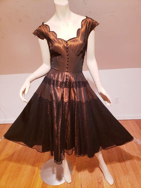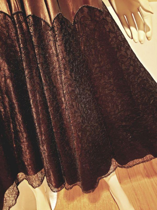 Shantung Sharkskin with Chantilly lace throughout the skirt and bodice.