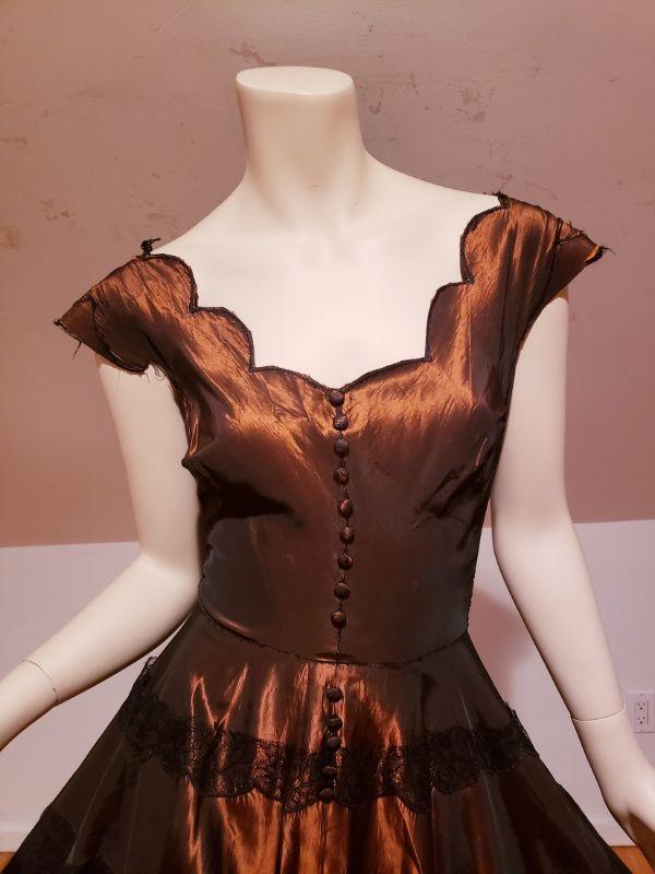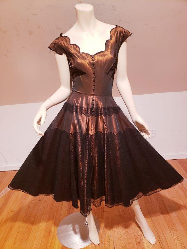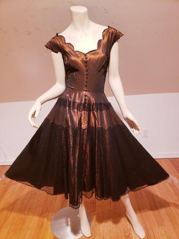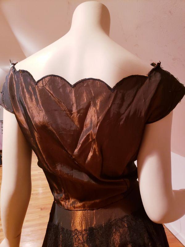 Shantung Sharkskin with Chantilly lace throughout the skirt and bodice.