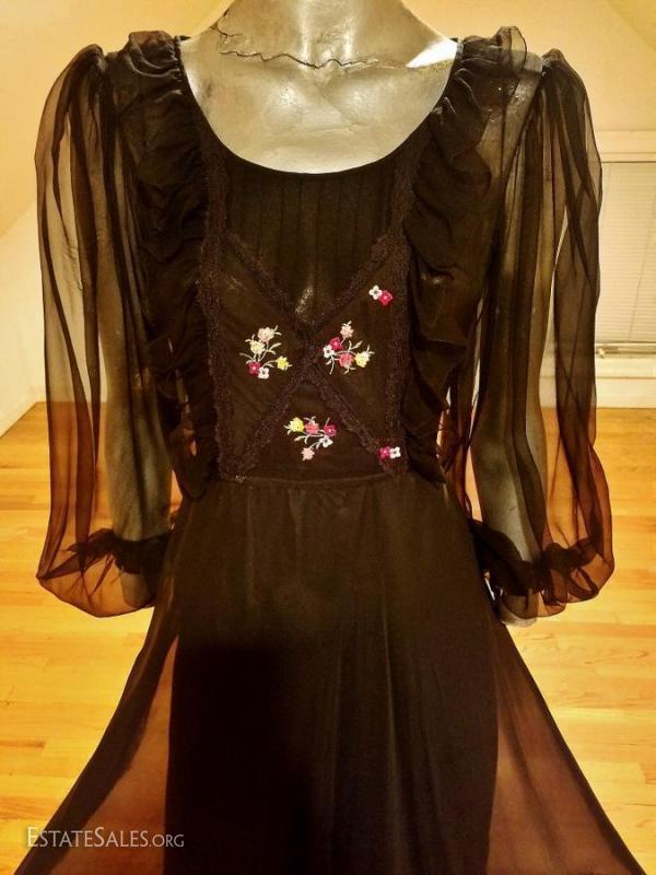 Vtg French 1960's poet embroidered ruffle maxi gown bouffant sleeve