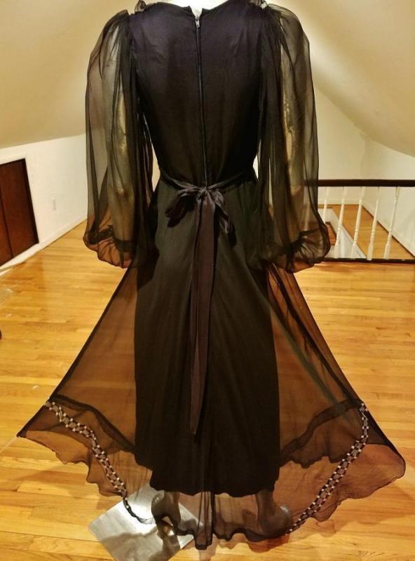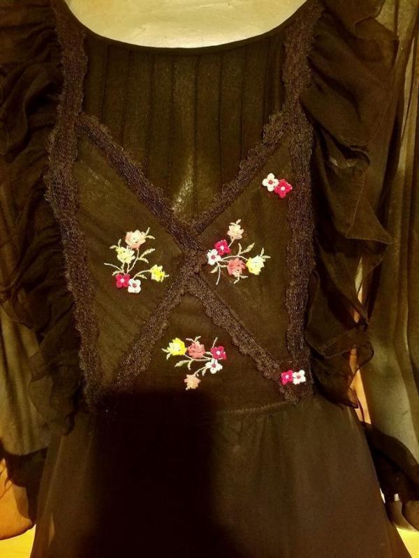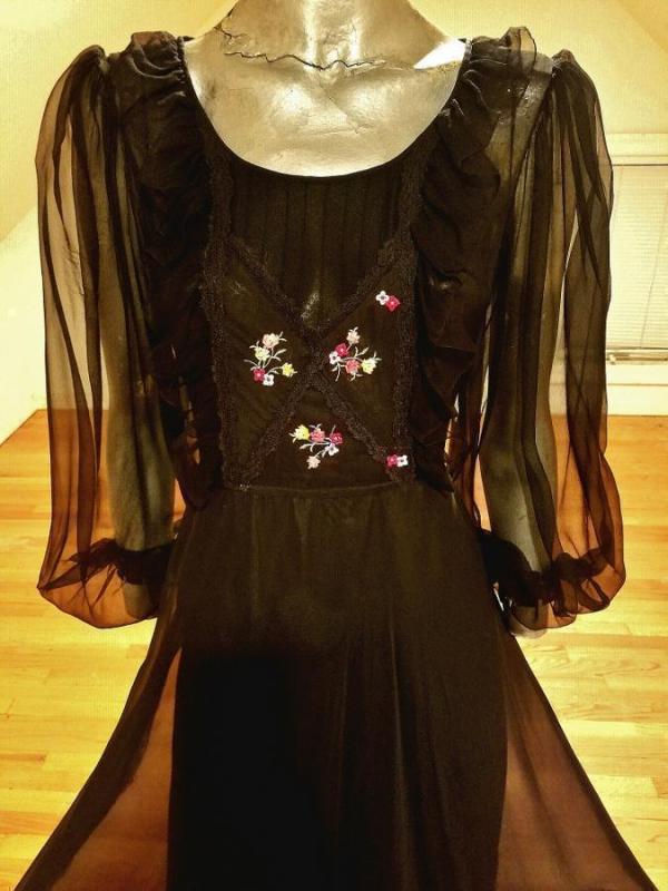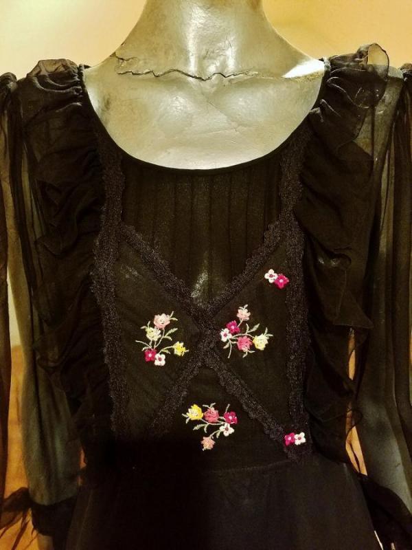 from L'ille France Campagne or Poet silk chiffon gown. Hand embroidered bibi front and embroidered ribbons on the fluid full skirt. In good vintage condition there are some tiny pinholes at the hem and sparingly but not noticeable.. A true ethnic festive gown very collectible.