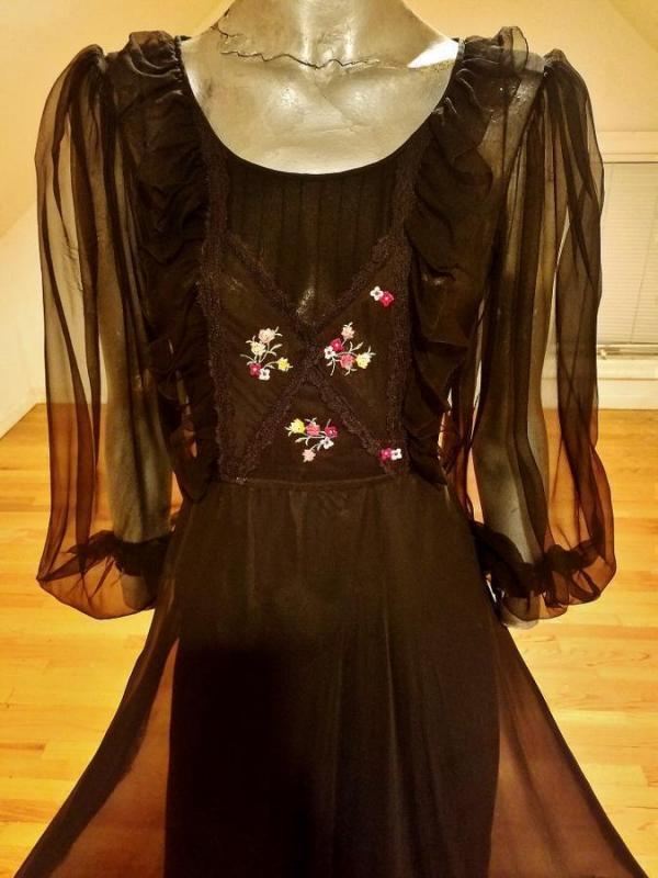 from L'ille France Campagne or Poet silk chiffon gown. Hand embroidered bibi front and embroidered ribbons on the fluid full skirt. In good vintage condition there are some tiny pinholes at the hem and sparingly but not noticeable.. A true ethnic festive gown very collectible.