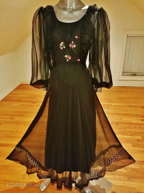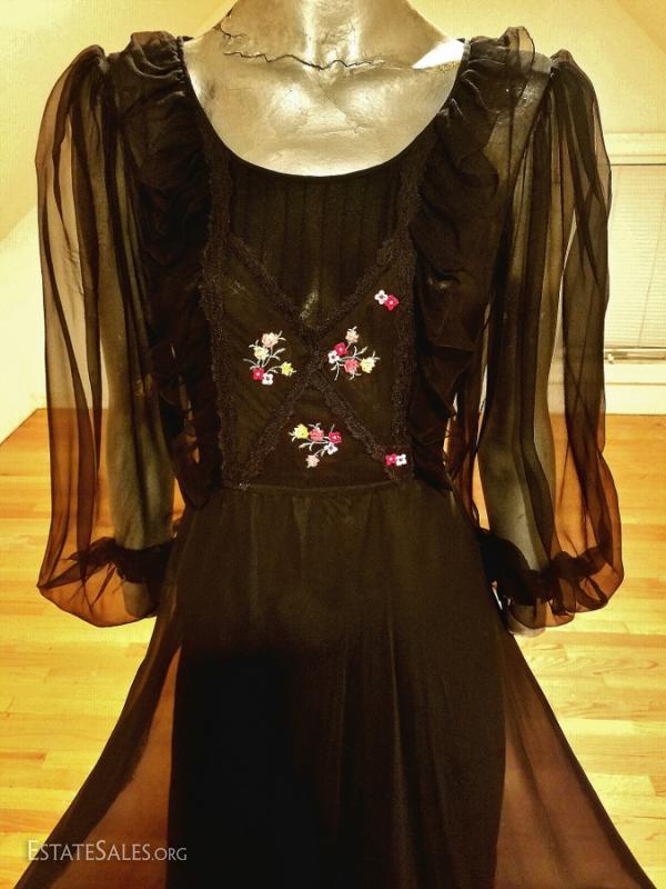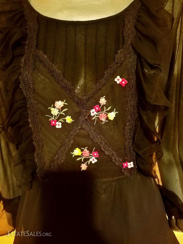 from L'ille France Campagne or Poet silk chiffon gown. Hand embroidered bibi front and embroidered ribbons on the fluid full skirt. In good vintage condition there are some tiny pinholes at the hem and sparingly but not noticeable.. A true ethnic festive gown very collectible.