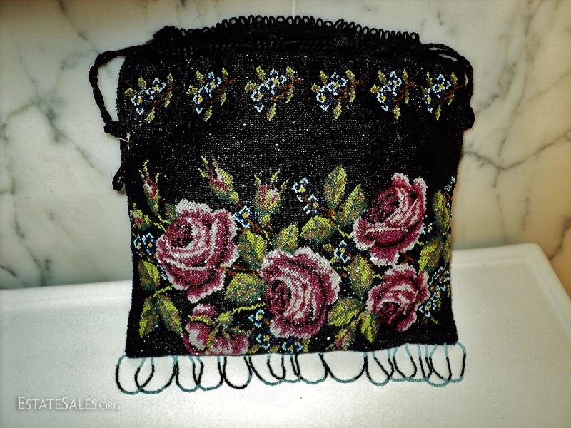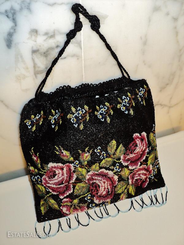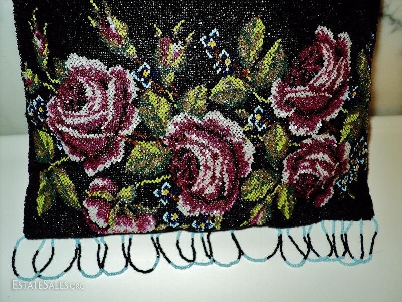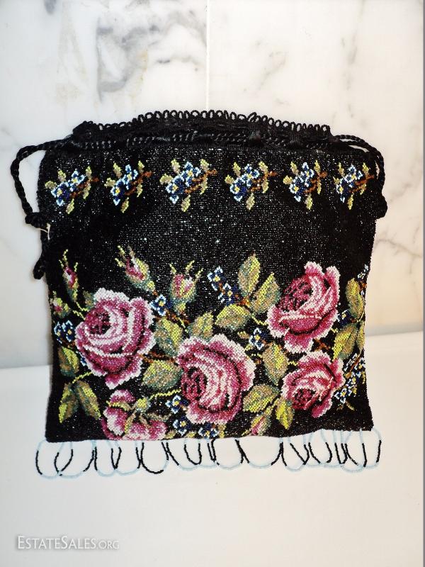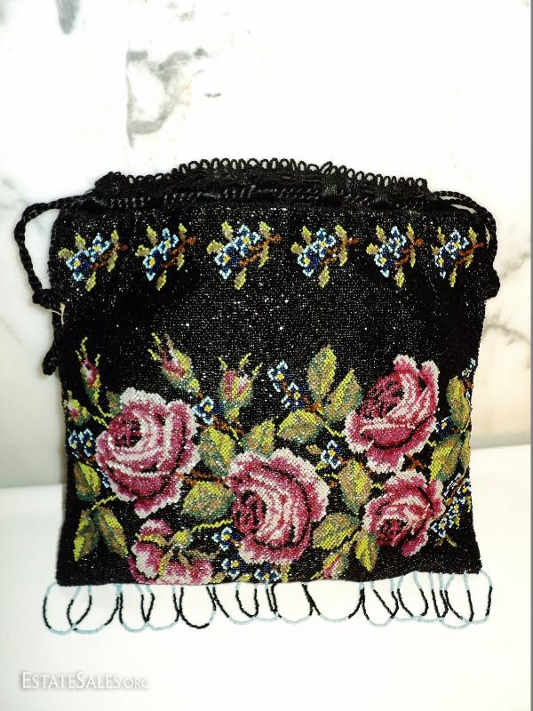 A rare beauty from the 1920-30's all hand embroidery of micro beads in a stunning floral design and vibrant colors. Has a silk night blue lining inside and drawstring handle. The lining is a bit frayed at a couple of small spots. Other than that this bag is a Stunner