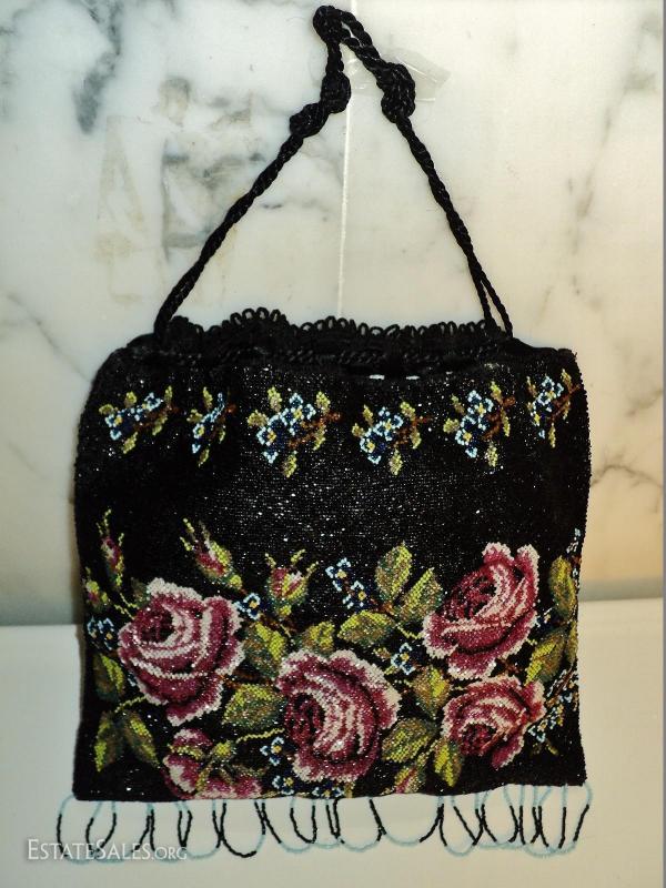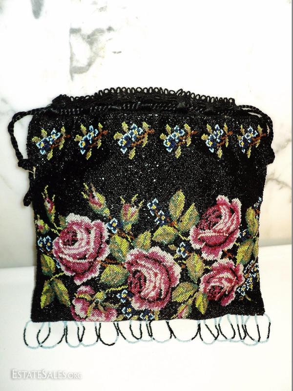 A rare beauty from the 1920-30's all hand embroidery of micro beads in a stunning floral design and vibrant colors. Has a silk night blue lining inside and drawstring handle. The lining is a bit frayed at a couple of small spots. Other than that this bag is a Stunner