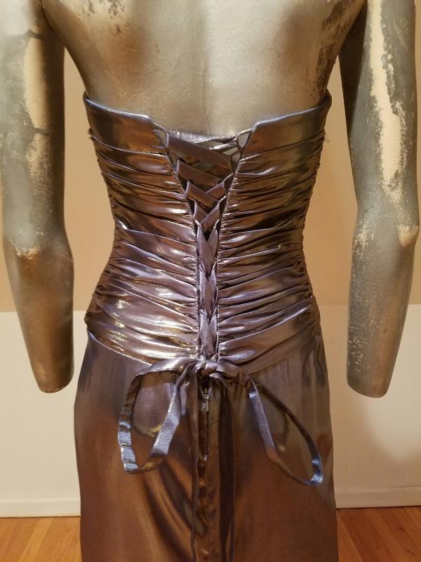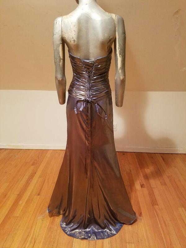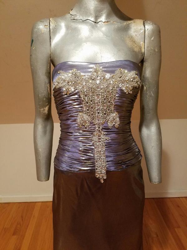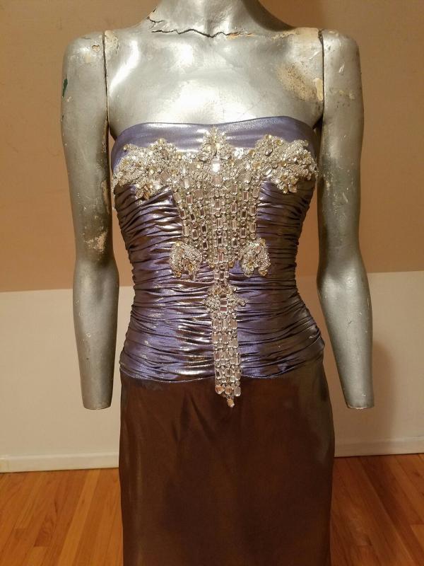This one is drop dead gorgeous with heavy mirrored embellishment at bodice. Strapless with bones and laced up at back also a demi zipper. It is a true Hollywood regency Look. Very fluid liquid fabric that shines while you walk. This one is fit for a queen. No pictures can do it justice, it is truly drop dead gorgeous.