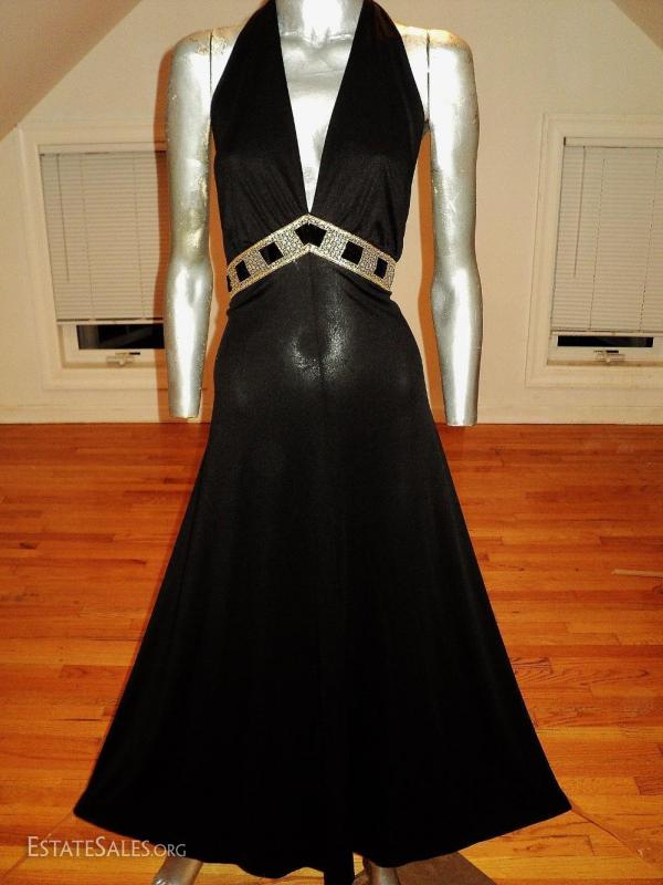 Very fluid halter gown . A knit lycra with a gold velvet empire sash