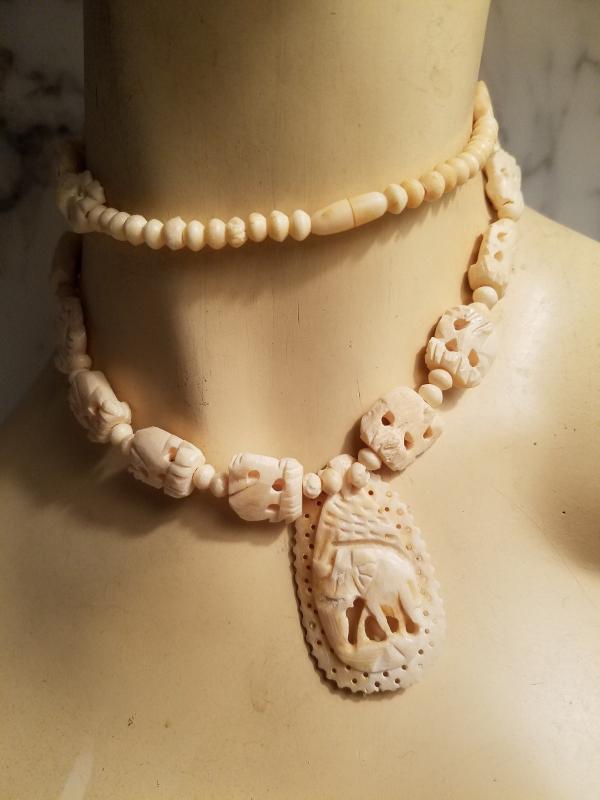 A real beauty all hand carved Bovine Bone necklace with elephant carved beads and a large carved