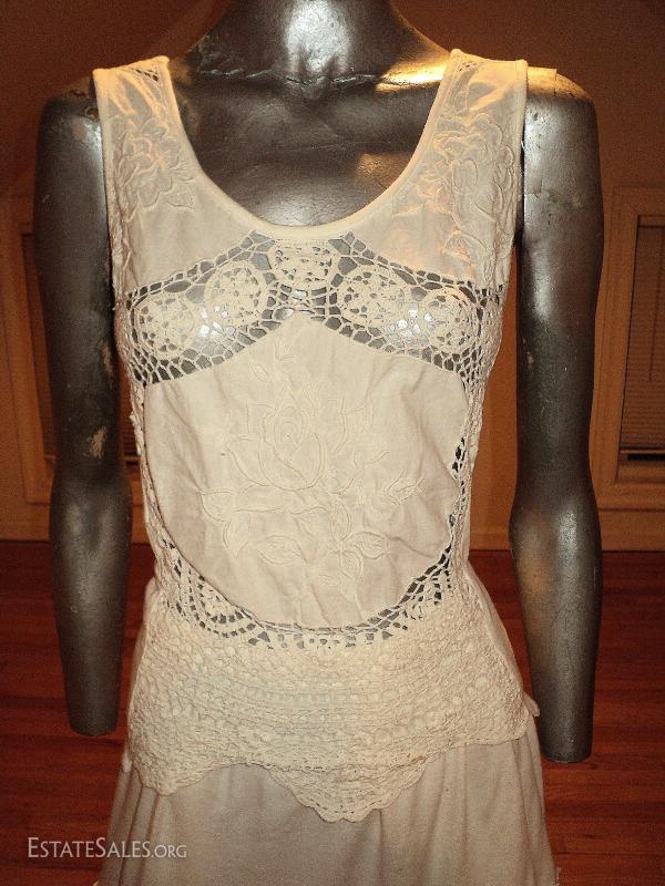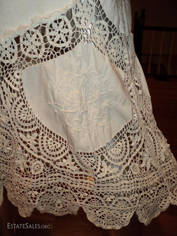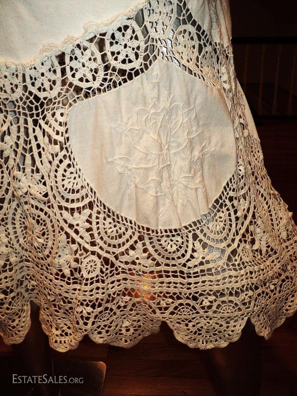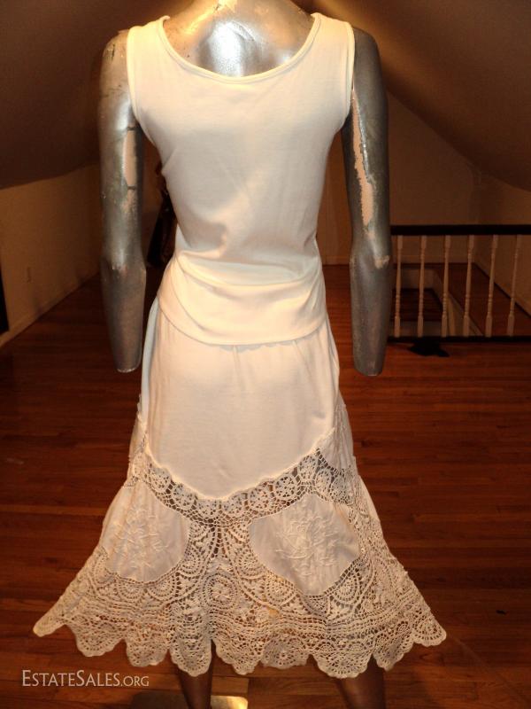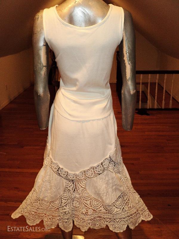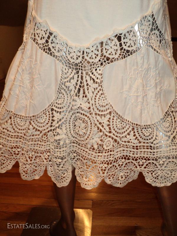 A real beauty of an ensemble top paired with a full sweep skirt in a combo of swiss hand embroidery of flowers cotton and cotton knit aired with hand crochet that are stunning. In amazing vintage condition a quite Boho Chic
