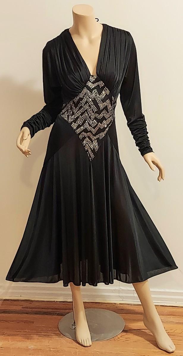 High low and heavily Embellished Jersey Silky black dress this one is a Beauty. In very good Vtg condition I believe 70-80s. A Size S/M
