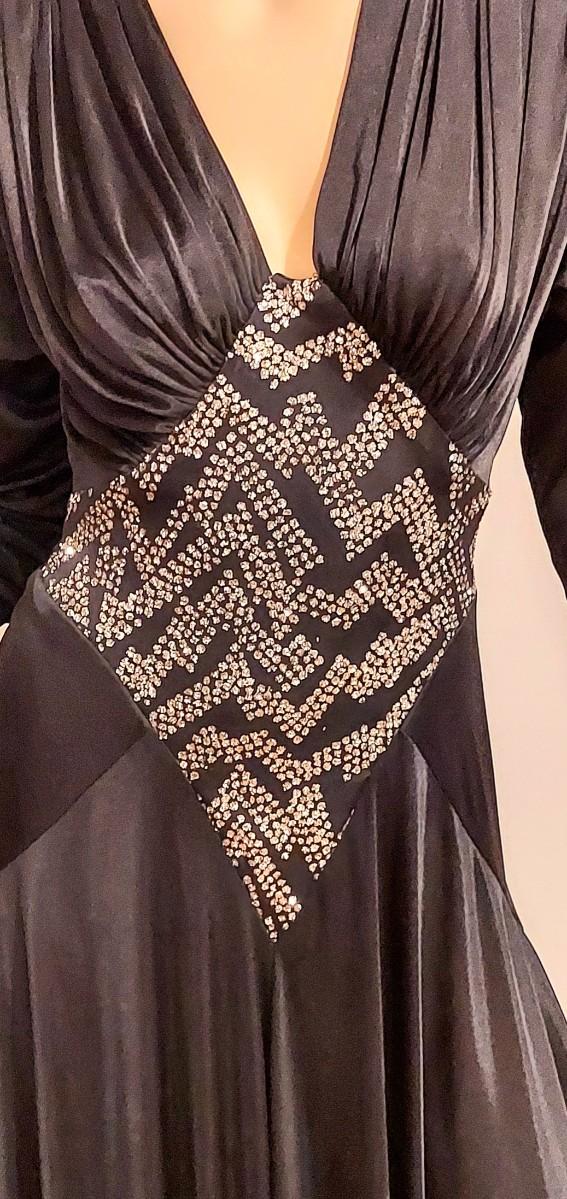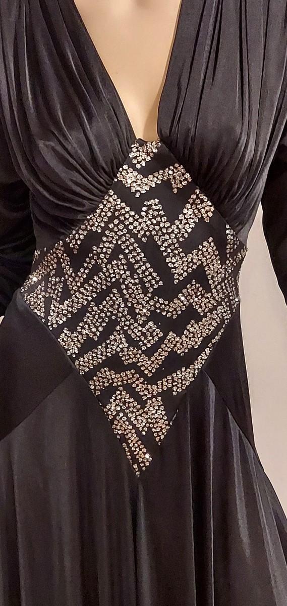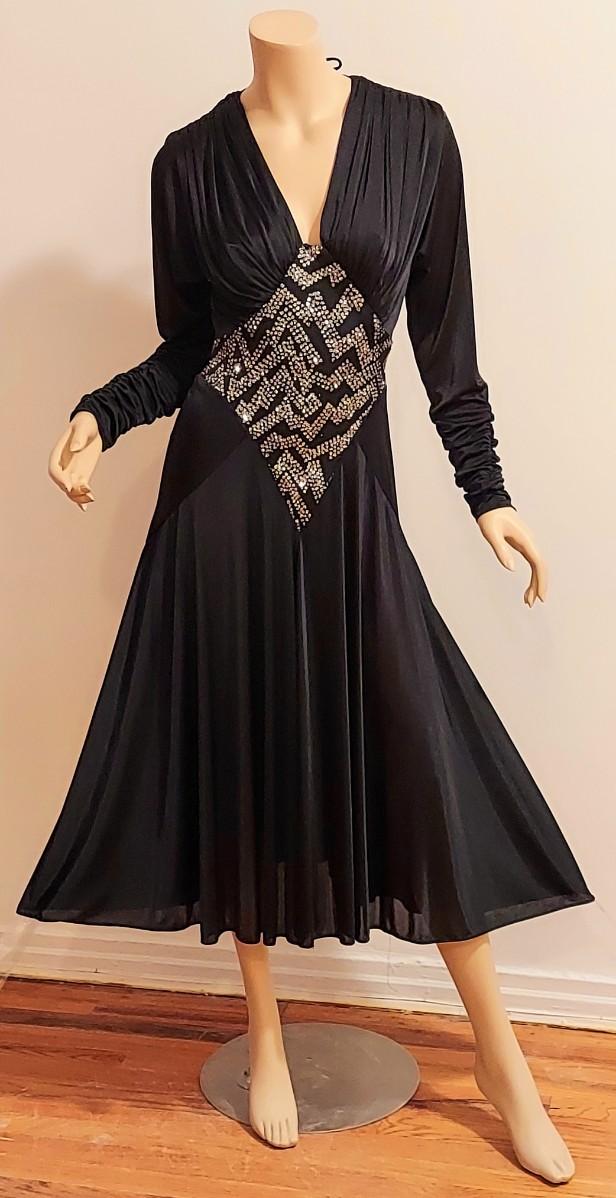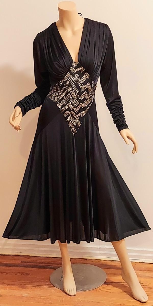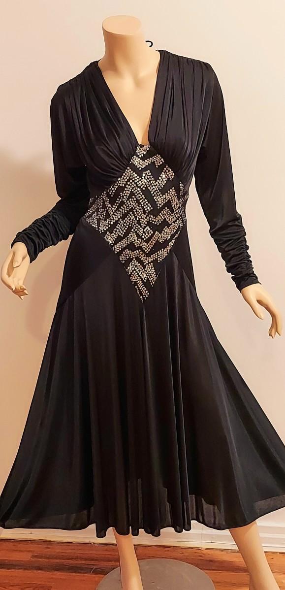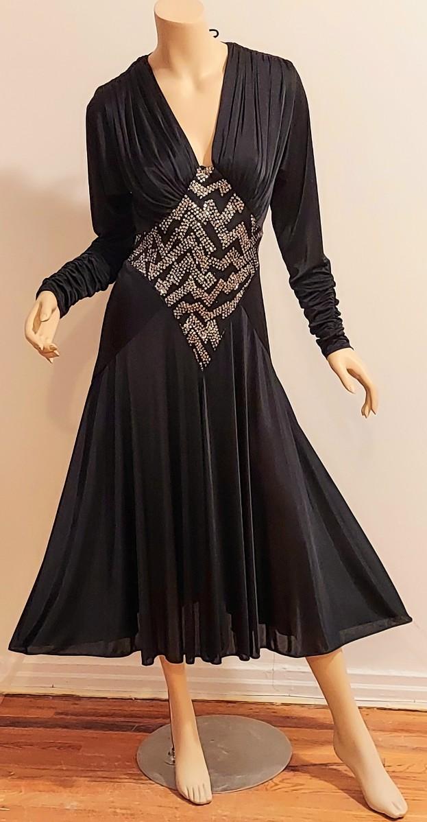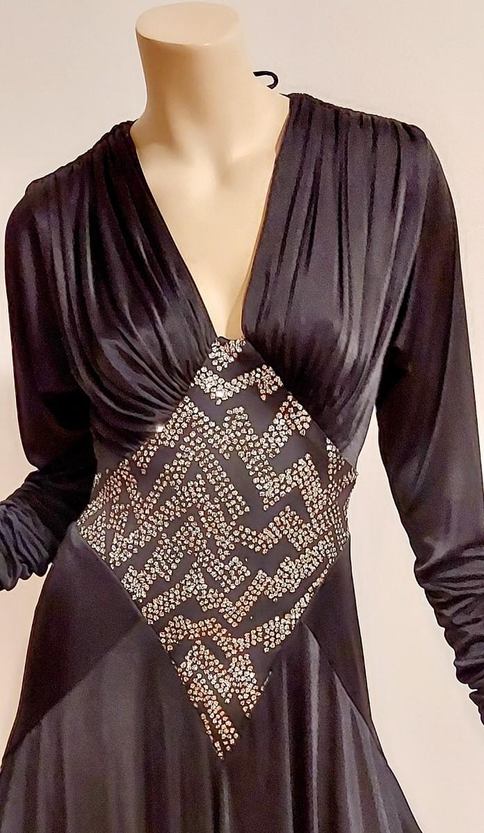 High low and heavily Embellished Jersey Silky black dress this one is a Beauty. In very good Vtg condition I believe 70-80s. A Size S/M