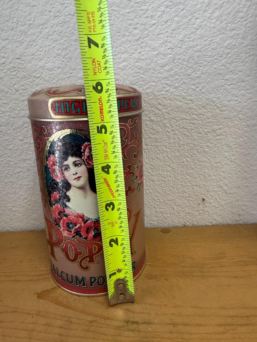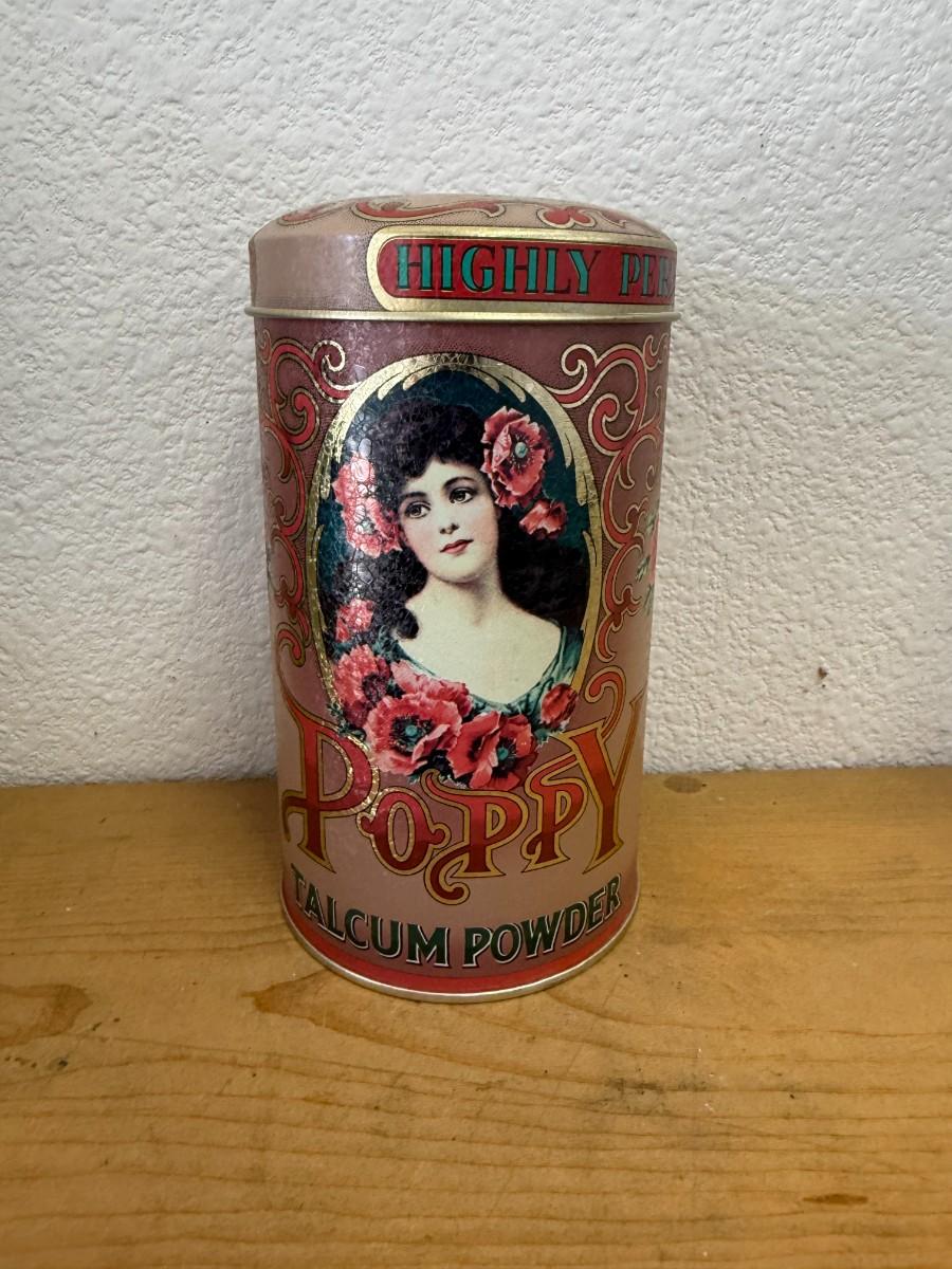 Vtg Highly Perfumed Poppy Talcum Powder tin, Art Nouveau flowers,