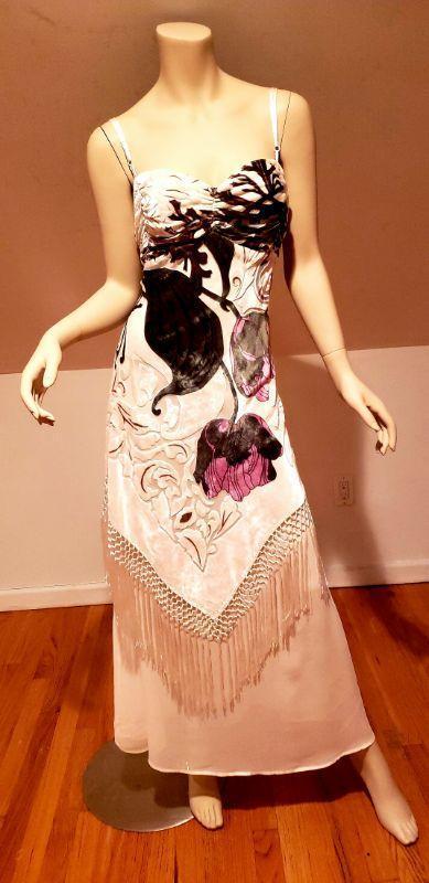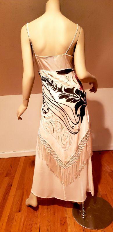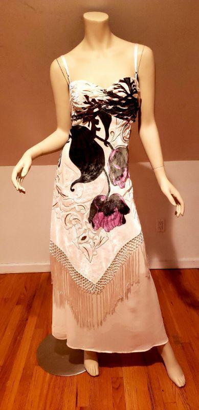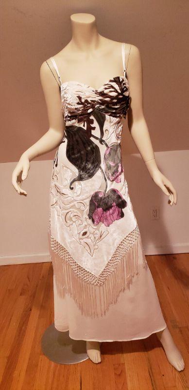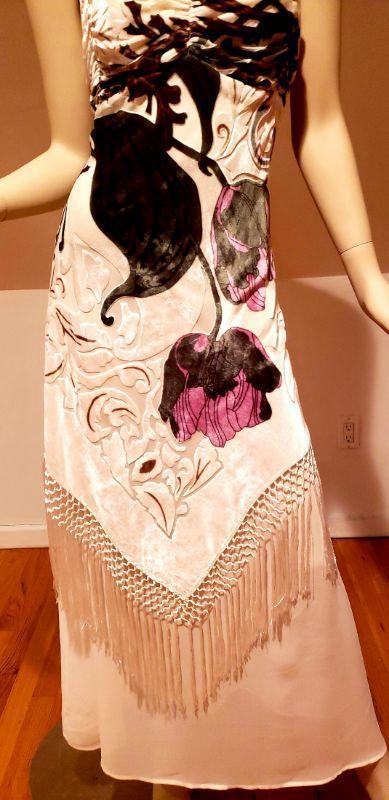 Burnout vlvet with stunning floral colored design high low fringed and adjustable spaghetti straps.