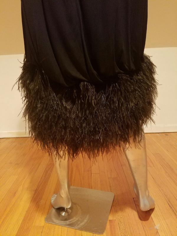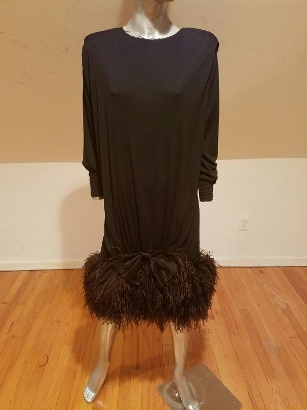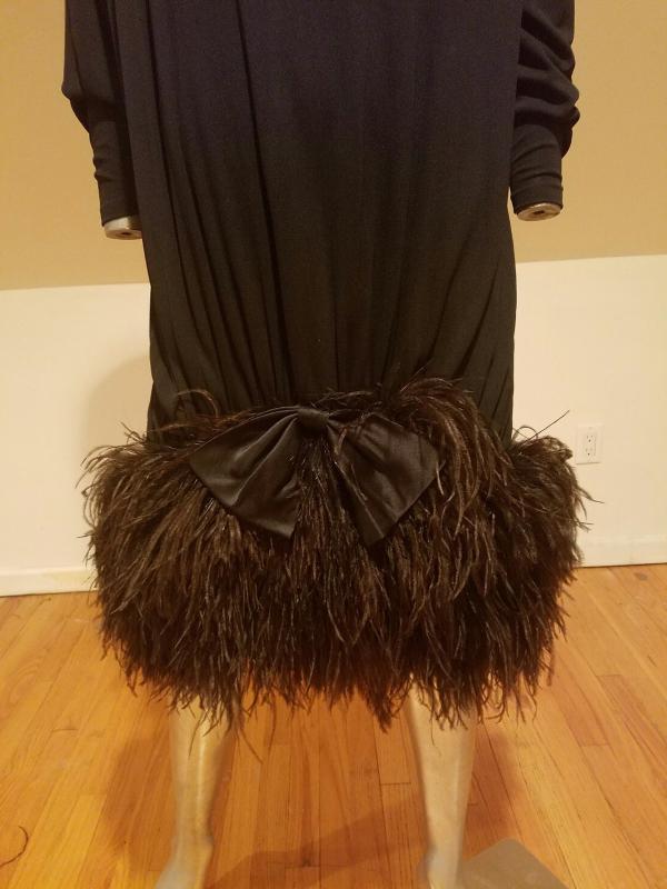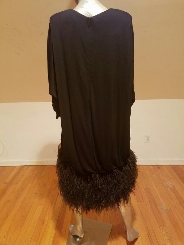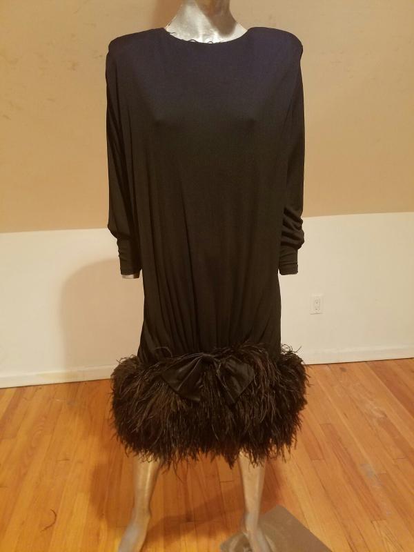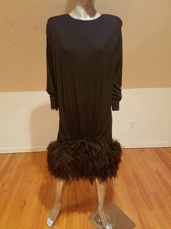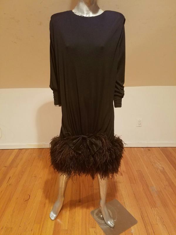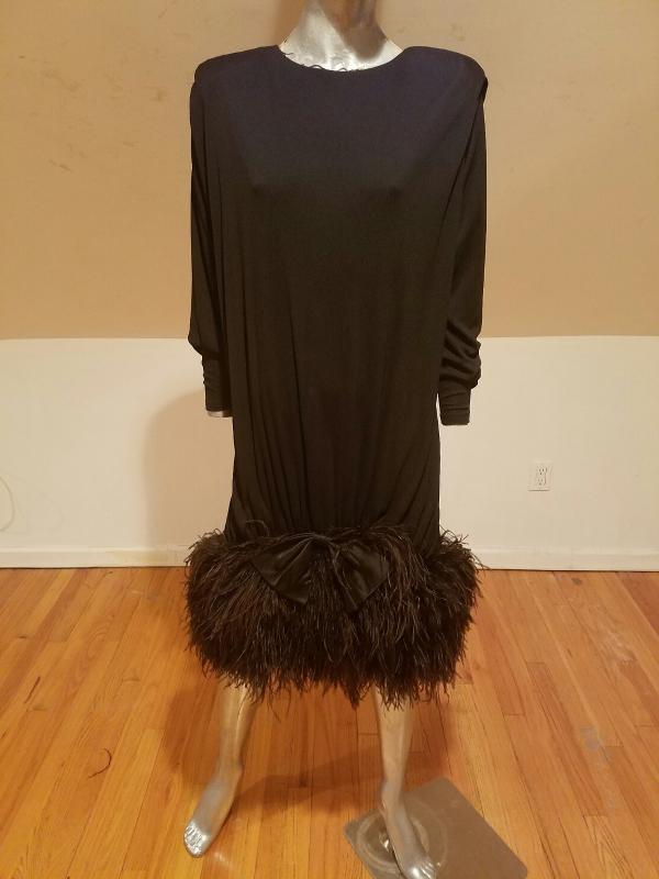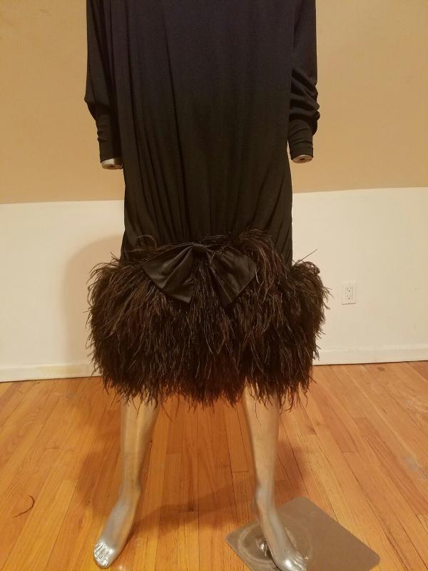 Long sleeve feather embellished special dress, featuring a satin bow , dolman cut sleeves , rounded neckline and back invisible zipper with hook and eye, lined.