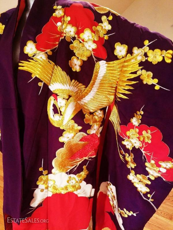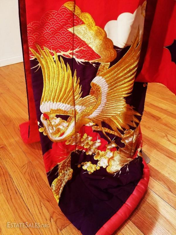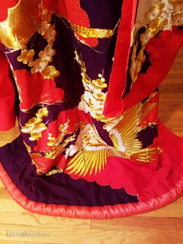 This is a Japanese silk brocade and all actual gold and white threads embroidered highly formal Kimono , worn only by a bride or at a stage performance, called Ushikaki..It is supposed to be worn outside the actual kimono as sort of a coat. One therefore never ties the Obi around the Ushikaki. It is also supposed to trail along the floor , that is also why it is heavily padded along the hem.. The colors on this one are bold and magnificent. Gold and white embroidered Cranes and tree blossom design..The lining is padded in red shimmers with gold threads. I was fortunate to purchase this from an amazing Estate of a Chinese Diplomat who lived in Kyoto Japan by the Gion district..No words nor pictures can describe the beauty and handwork of this to Die for Ushikaki. I believe it is from the very late 1940's or 1950's and in very good vintage condition for its age, An amazing piece of japanese History of wearable art. And what an Art this one is will fit a M/L