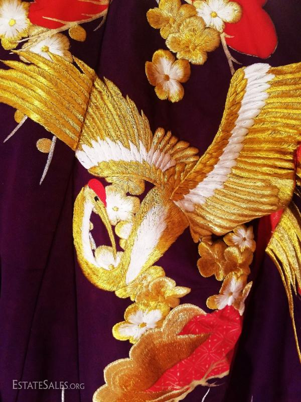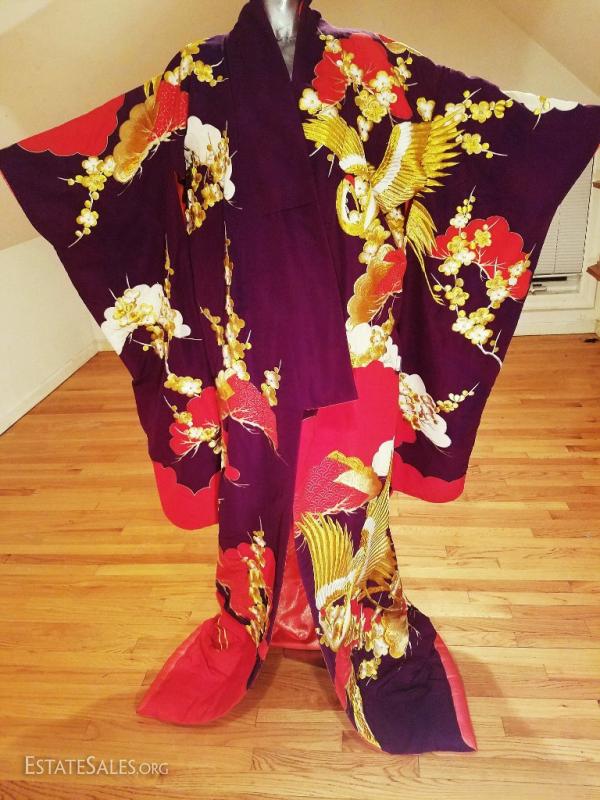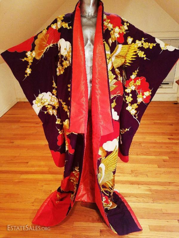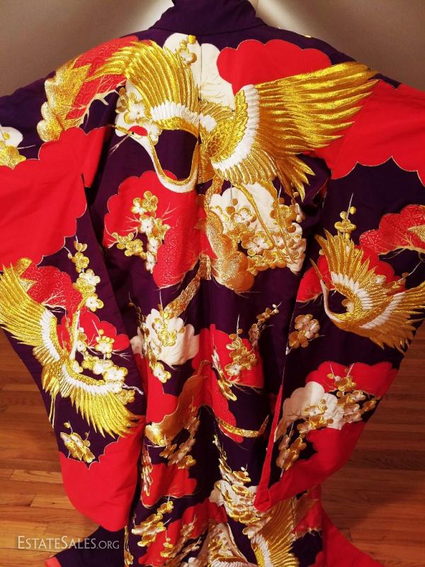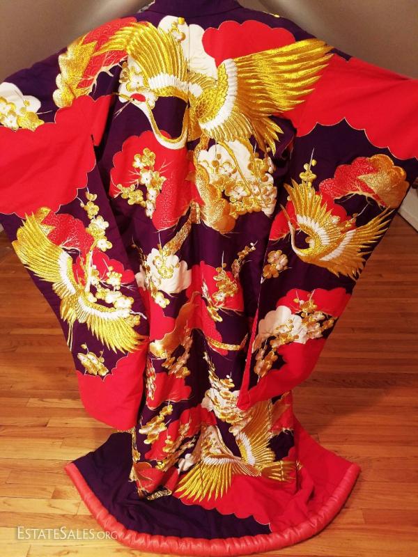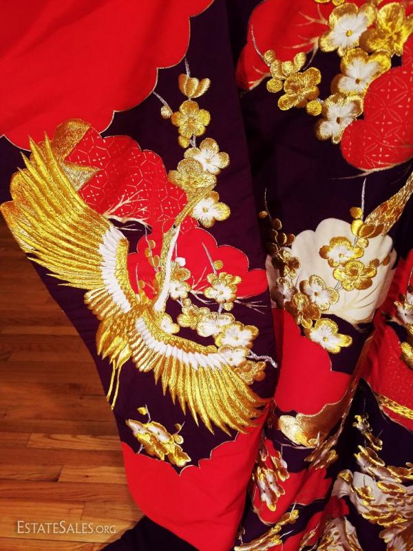This is a Japanese silk brocade and all actual gold and white threads embroidered highly formal Kimono , worn only by a bride or at a stage performance, called Ushikaki..It is supposed to be worn outside the actual kimono as sort of a coat. One therefore never ties the Obi around the Ushikaki. It is also supposed to trail along the floor , that is also why it is heavily padded along the hem.. The colors on this one are bold and magnificent. Gold and white embroidered Cranes and tree blossom design..The lining is padded in red shimmers with gold threads. I was fortunate to purchase this from an amazing Estate of a Chinese Diplomat who lived in Kyoto Japan by the Gion district..No words nor pictures can describe the beauty and handwork of this to Die for Ushikaki. I believe it is from the very late 1940's or 1950's and in very good vintage condition for its age, An amazing piece of japanese History of wearable art. And what an Art this one is will fit a M/L