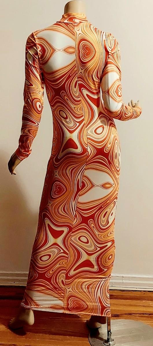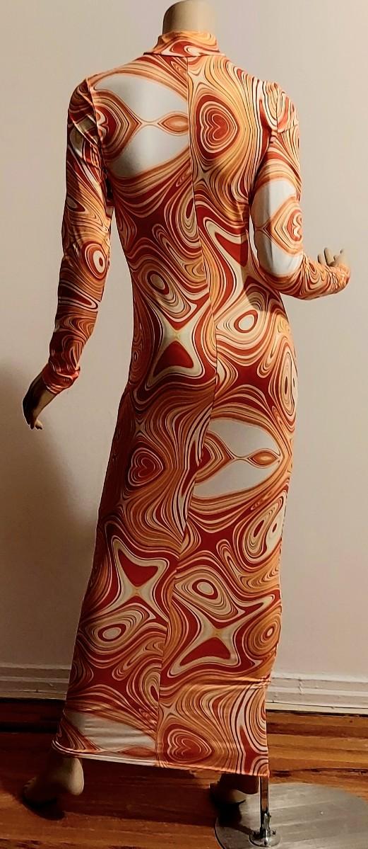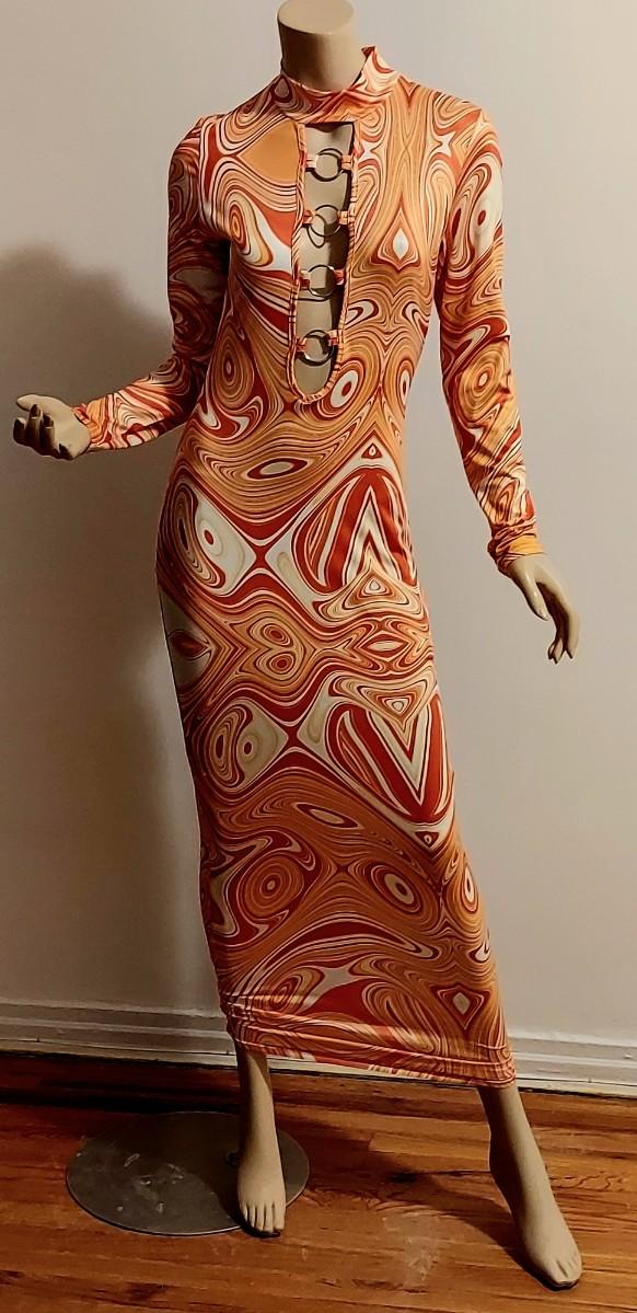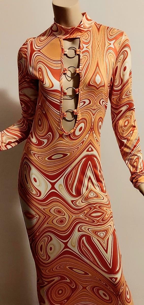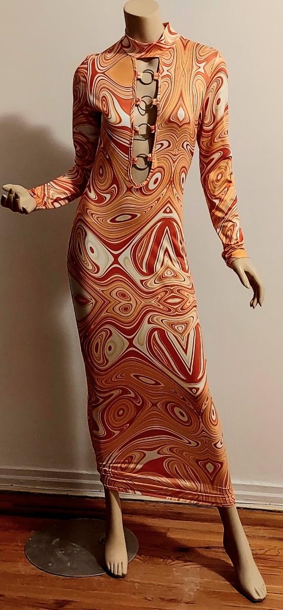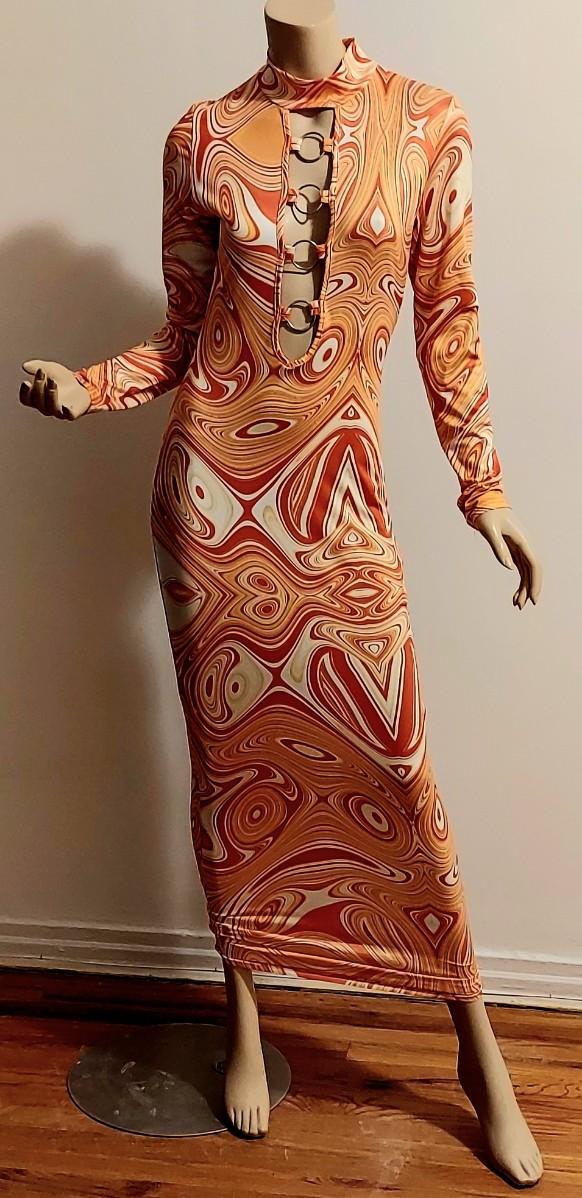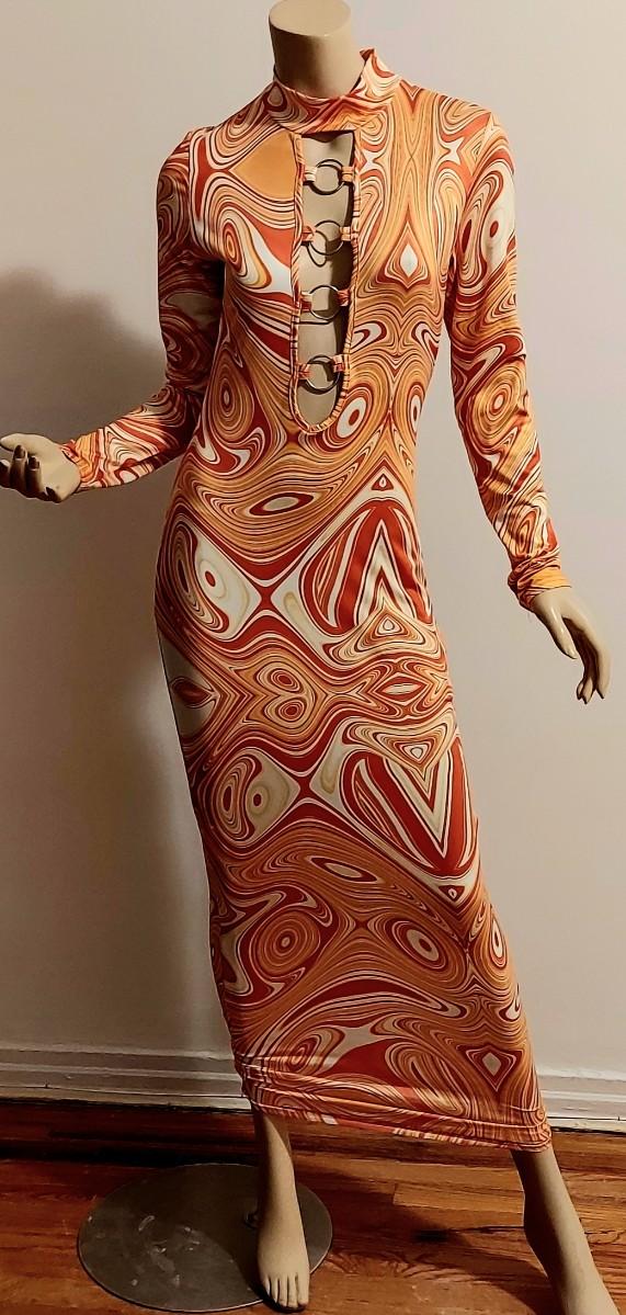 A really beautiful Body Con Maxi dress. Orange Swirl Design. Metal Ring open Front Bodice. Will Stretch