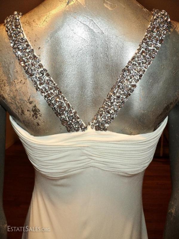 Stunning is the word for this amazing Jovani Grecian gown ,. The bust line is shirred details with with straps detail that are all covered with crystal beads Austrian or Swarovski