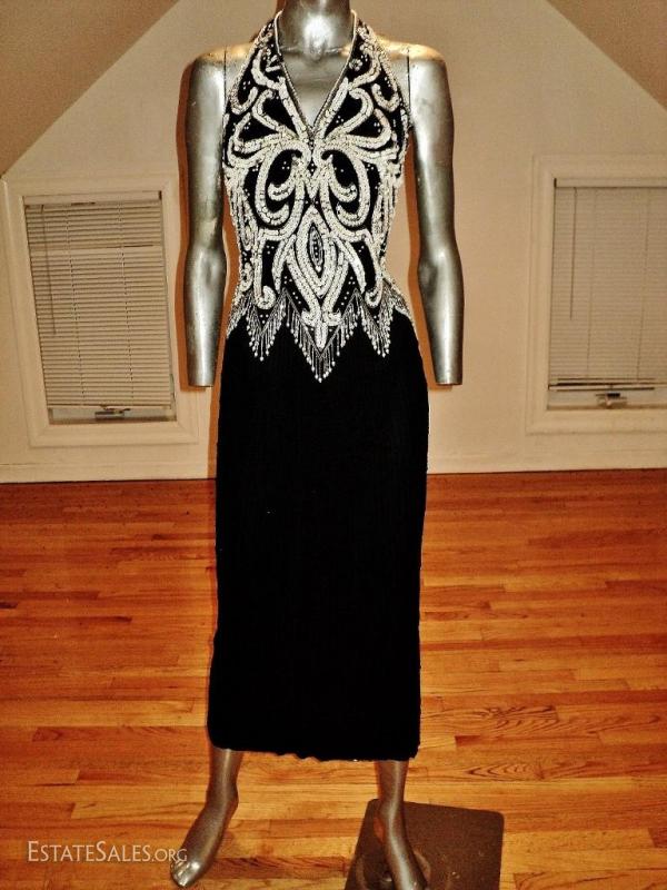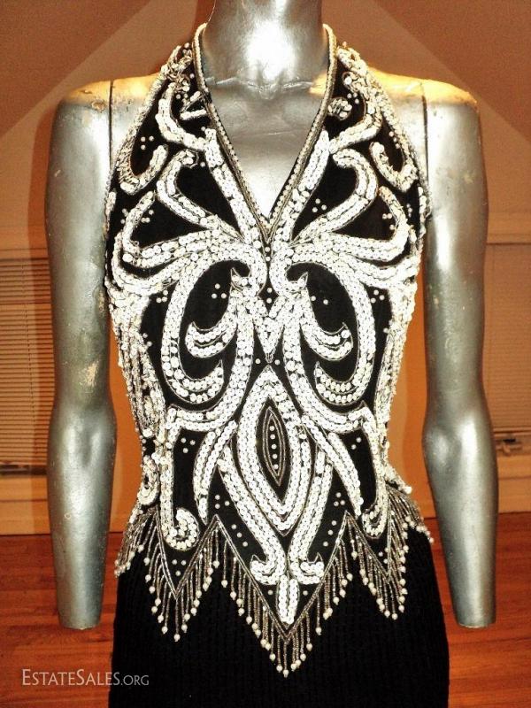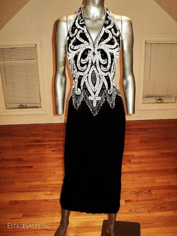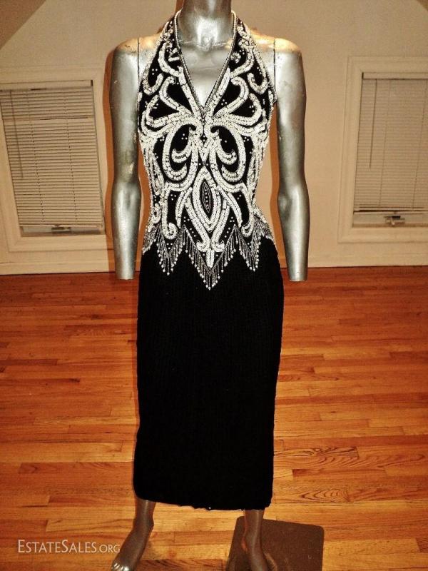 Vtg Jovani silk halter maxi all beaded & sequined black & white Gown