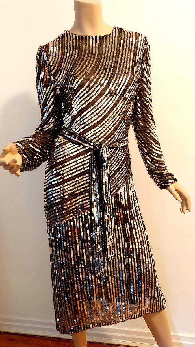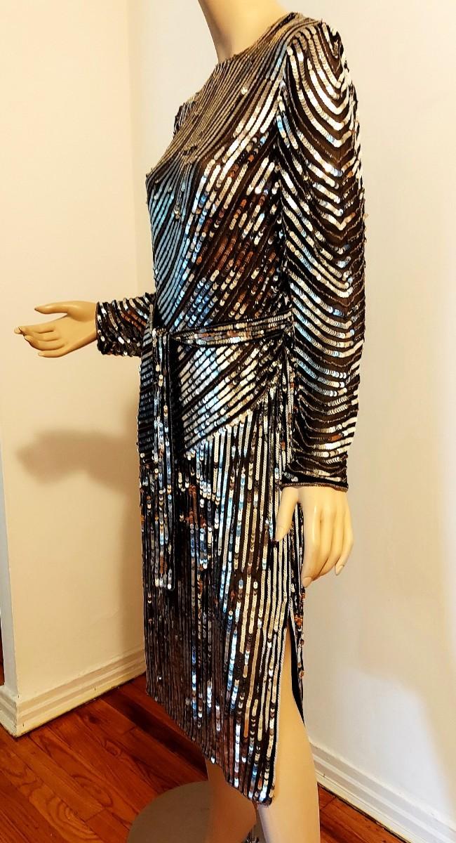 A True Stunner Very rare Judith Ann Fully Silver Sequin Layering midi Dress with Sash belt.