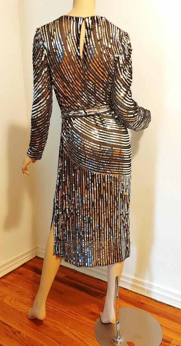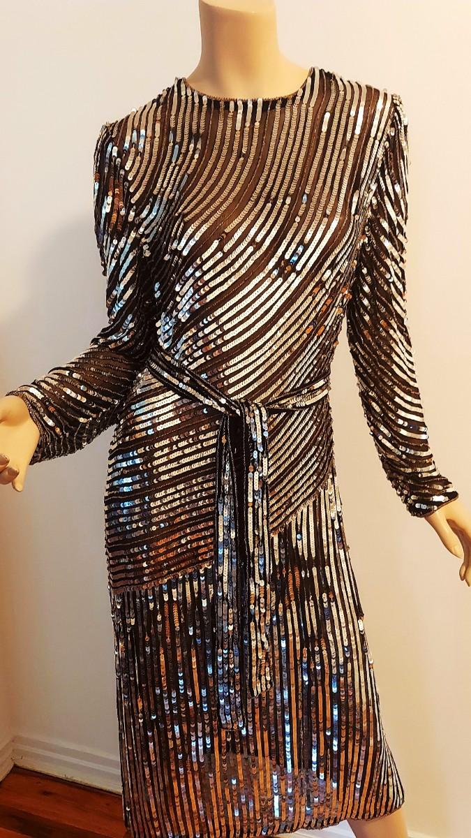 Vtg Judith Ann Creations Silver Payette Layering Midi dress W/Belt