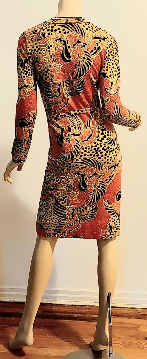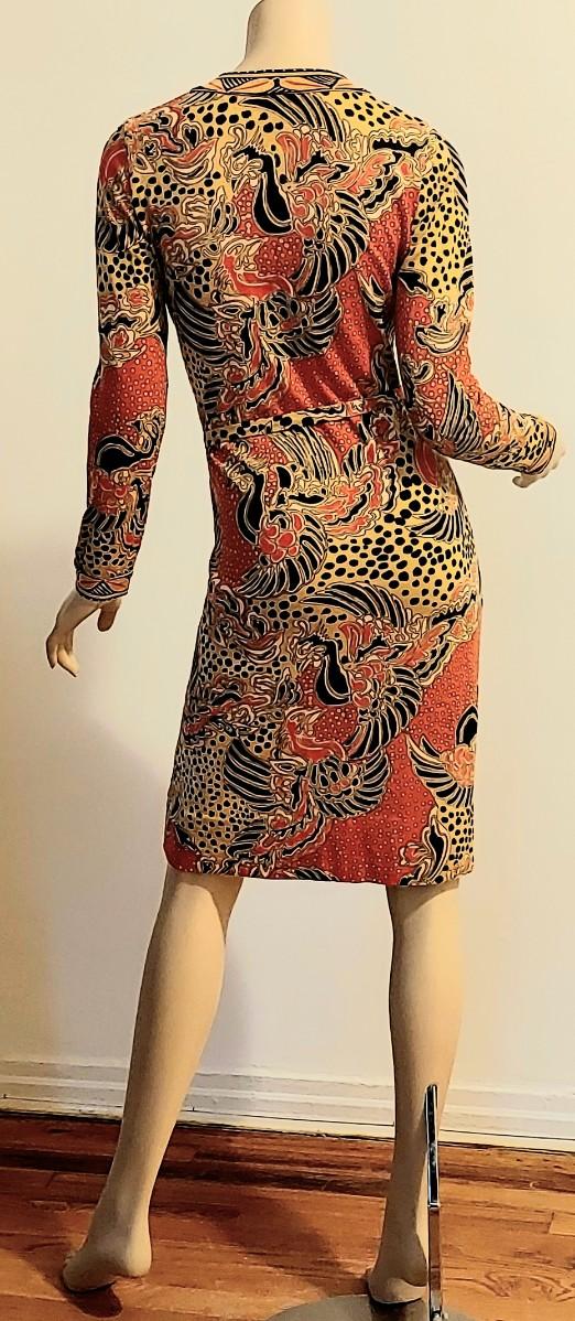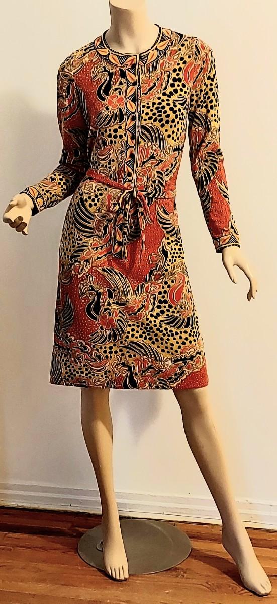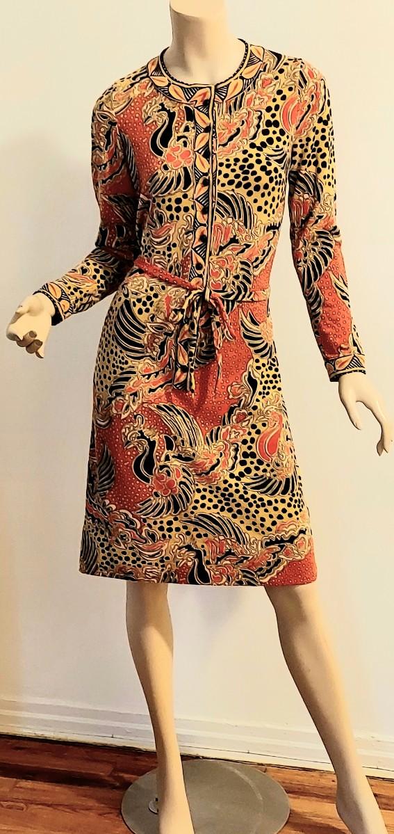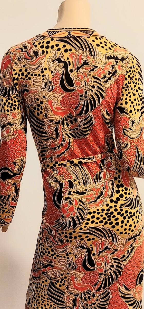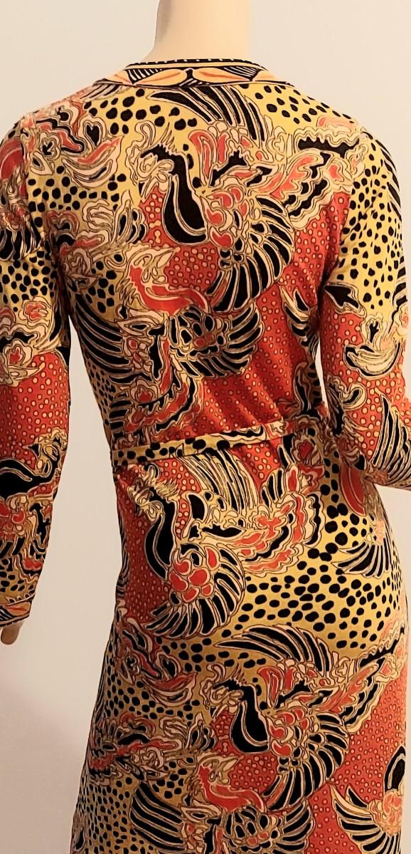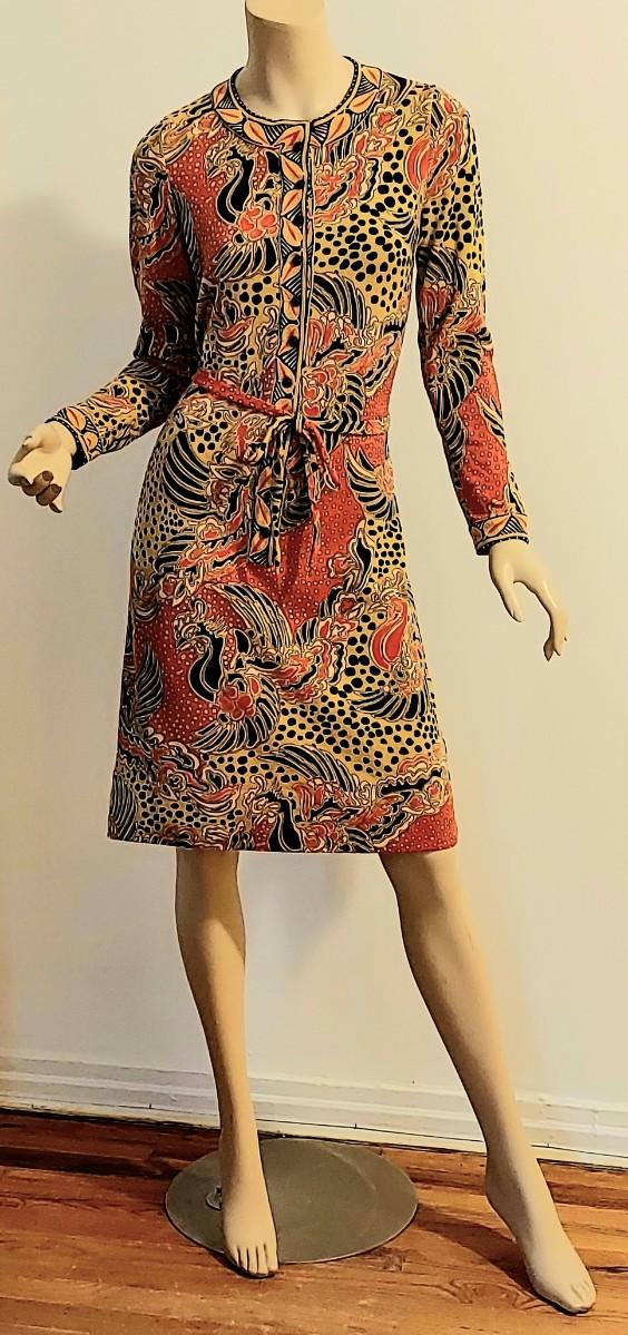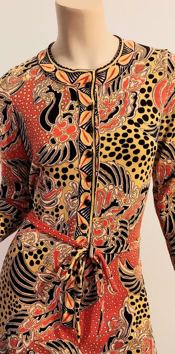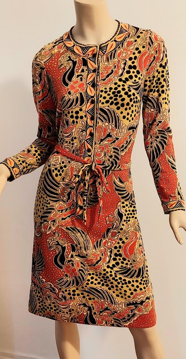 Truly an Amazing a 60-70s Goldworm Dragon print wiggle dress with its own Sash. Front onyx black Buttons closure. The hand print is Dragon style, colors are vivid and beautiful.