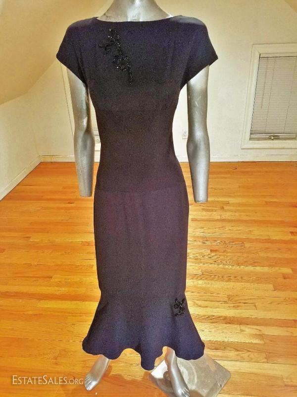 Embellished with a touch of black onyx beads at top bodice and flared skirt.. It is a stunner. In very good condition except for a tiny hairline fissure at the back that is hardly noticeable.. Pix were taken with extra bright lights to show details. The dress is a black in coloration.